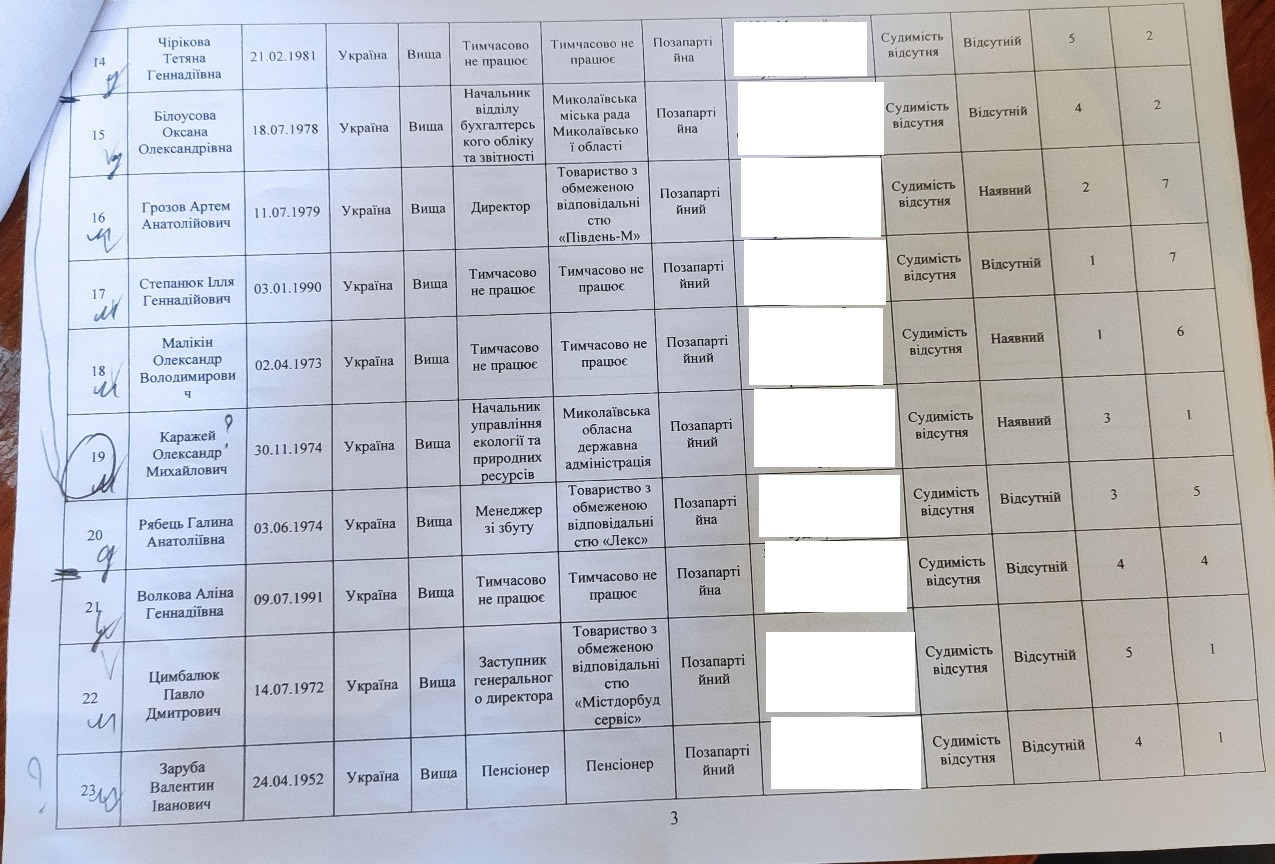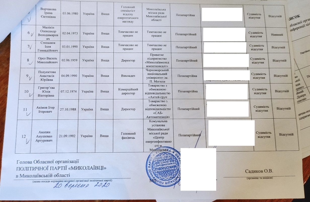 26 вересня під час засідання Миколаївської районної територіальної виборчої комісії розглядалось питання реєстрації списків кандидатів у депутати Миколаївської районної ради. Місцева організація політичної партії «Миколаївці» подала документи до Миколаївської районної територіальної виборчої комісії 24 вересня, про що свідчить запис у журналі вхідної документації. Так, 26 вересня, ознайомившись із єдиним виборчим списком місцевого осередку політичної партії «Миколаївці», комісія зазначала, що у п'ятірці з 16 по 20 номери − чотири особи чоловічої статі та одна жіночої, а в першому територіальному списку номери двох п'ятірок відповідають нормам Виборчого кодексу України, а от кандидати під номерами 11 та 12 однієї статі. Всього в першому територіальному списку 12 осіб. Голова Миколаївської районної територіальної виборчої комісії Євген Христинюк запропонував прийняти рішення про відмову в реєстрації кандидатів через порушення порядку висування кандидатів, встановленого Кодексом. Із присутніх на засіданні 10 членів комісії рішення підтримали дев’ятеро, один утримався, рішення не було прийняте. Комісія відклала розгляд цього питання, мотивуючи тим, що це не є порушенням п'ятиденного терміну, відведеного на реєстрацію або відмову у реєстрації.