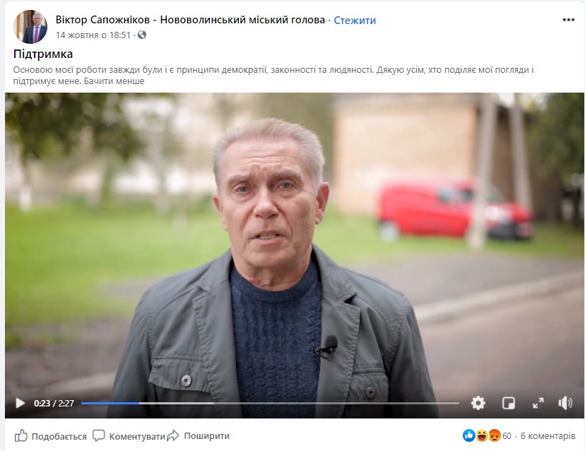 Відео опублікували на сторінці «Віктор Сапожніков – Нововолинський міський голова» 14 жовтня. Зауважимо, що у ролику чоловік не представляється. Однак у коментарях під дописом користувач Руслан Соловйов написав, що на відео – голова ДВК, і він не має права агітувати.