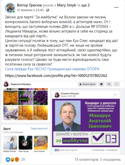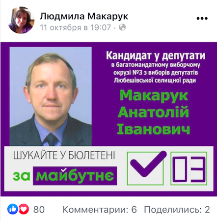 У дописі, написаному 11 жовтня, містилася картинка із зображенням кандидата у депутати Любешівської селищної ради Анатолія Макарука, а також імпровізована галочка та №3 і логотип партії «За майбутнє».