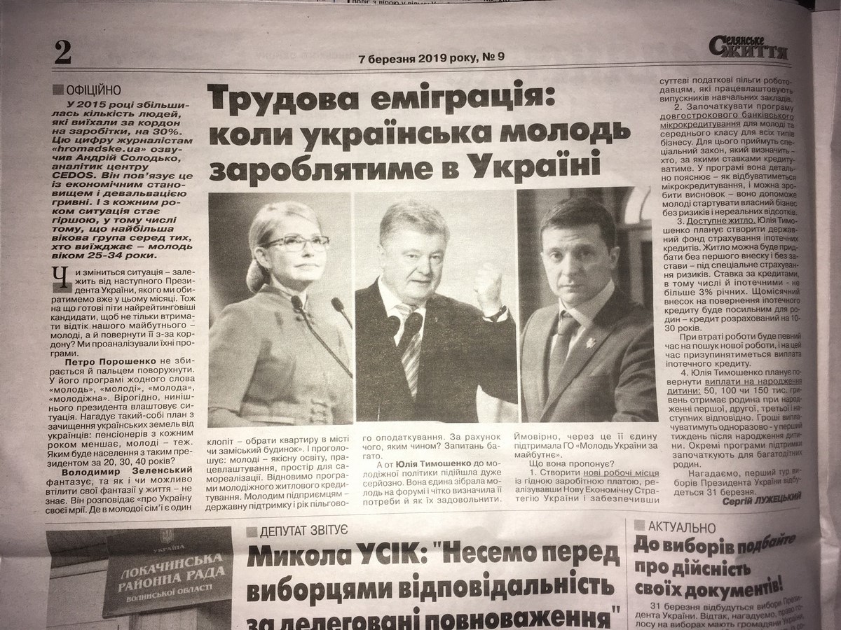 Зокрема, 7 березня 2019 року в Локачинській районній газеті «Селянське життя» в рубриці «Офіційно» опубліковано матеріал з таким заголовком: «Трудова еміграція: коли українська молодь зароблятиме в Україні» з позитивним змістом щодо кандидата в Президенти Юлії Тимошенко (ВО «Батьківщина») та з негативним змістом щодо кандидатів Петра Порошенка (самовисування) та Володимира Зеленського («Слуга народу»), без відповідного маркування.