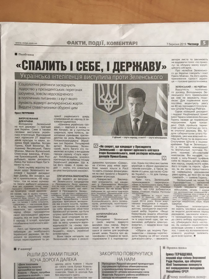 В обласній газеті «Волинь» за 7 березня опублікували матеріал під назвою «Спалить і себе, і державу. Українська інтелігенція виступила проти Зеленського» з негативною інформацією відповідно про Володимира Зеленського. Стаття розміщена у рубриці «Політика». У цьому ж номері газети в рубриці «Політика» опублікували ще один матеріал проти Володимира Зеленського під назвою «Чому Зеленський не повинен стати Президентом: 5 причин». У публікаціях кандидату нав’язують імідж «маріонетки».