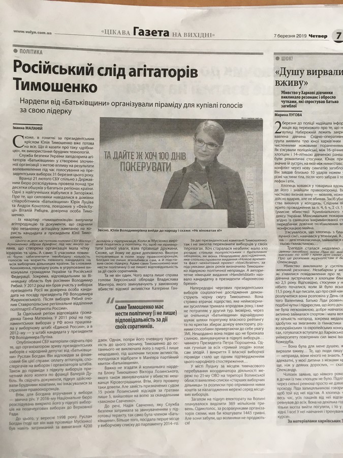 Також на шпальтах газети «Волинь» виявили негативний матеріал про Юлію Тимошенко. Зокрема, йдеться про статтю під назвою «Російський слід агітаторів Тимошенко», в якій розповідають про нардепів з партії ВО «Батьківщина», які «скуповують голоси для Юлії Тимошенко».