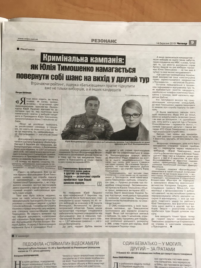 Окрім того, в газеті «Волинь» за 14 березня розмістили публікацію під назвою «Кримінальна кампанія: Як Юлія Тимошенко намагається повернути собі другий шанс на вихід у другий тур». В матеріалі йдеться про двох кандидатів у Президенти – Юлію Тимошенко та Юрія Тимошенка. У статті зазначається, що «втрачаючи рейтинг, лідерка «Батьківщини» прагне підкупити вже не тільки виборців, а й інших кандидатів».