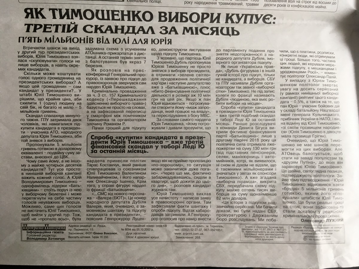 Схожа стаття опублікована в газеті «Програма-Панорама» за 14 березня під назвою «Як Тимошенко вибори купує: Третій скандал за місяць. П'ять мільйонів від Юлі для Юрія». У статті також йдеться про те, що «спроба купити кандидата в Президенти Юрія Тимошенка – вже третій фінансовий скандал у таборі Леді Ю за останній місяць».