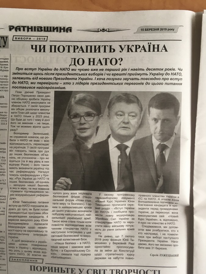 14 березня в Локачинській районній газеті «Селянське життя» та Володимир-Волинській міській газета «Місто вечірнє» в рубриках «Офіційно» і «На власний погляд» опублікували статтю «Коли Україна стане членом НАТО» без відповідного маркування. Матеріал містить позитивні відомості щодо кандидатки в Президенти Юлії Тимошенко та з негативним змістом щодо кандидатів Петра Порошенка та Володимира Зеленського.
