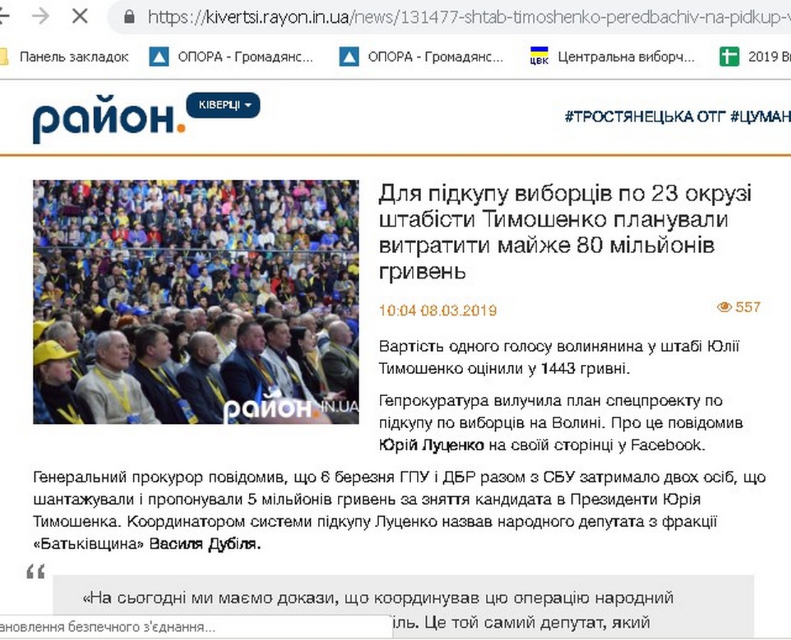 Зауважимо також, що у березні ще 35 негативних матеріалів виявили в онлайн-ЗМІ. Так, 7 березня на сайті «Район. Локачі» опублікували матеріал «Штаб Тимошенко планував потратити 84 мільйони на підкуп виборів в окрузі № 20», а 8 березня ідентичний матеріал опублікував «Район. Турійськ». Також 8 березня 2019 року в інтернет-виданні «Район.Горохів» розмістили статтю під назвою «Штаб Тимошенко передбачив на підкуп по Горохівському окрузі 84 мільйони». Цього ж дня на сайті «Район.Луцьк» опублікували матеріал «Штабісти Тимошенко заклали на підкуп лучан 59 мільйонів гривень». 8 березня на інтернет-ресурсі «Район.Рожище» опубліковано статтю зі схожим заголовком «Штаб Тимошенко передбачив на підкуп виборців 20 округу 84 мільйони гривень, - Генпрокуратура». Усі ці публікації містять негативний зміст щодо кандидата в президенти Юлії Тимошенко.