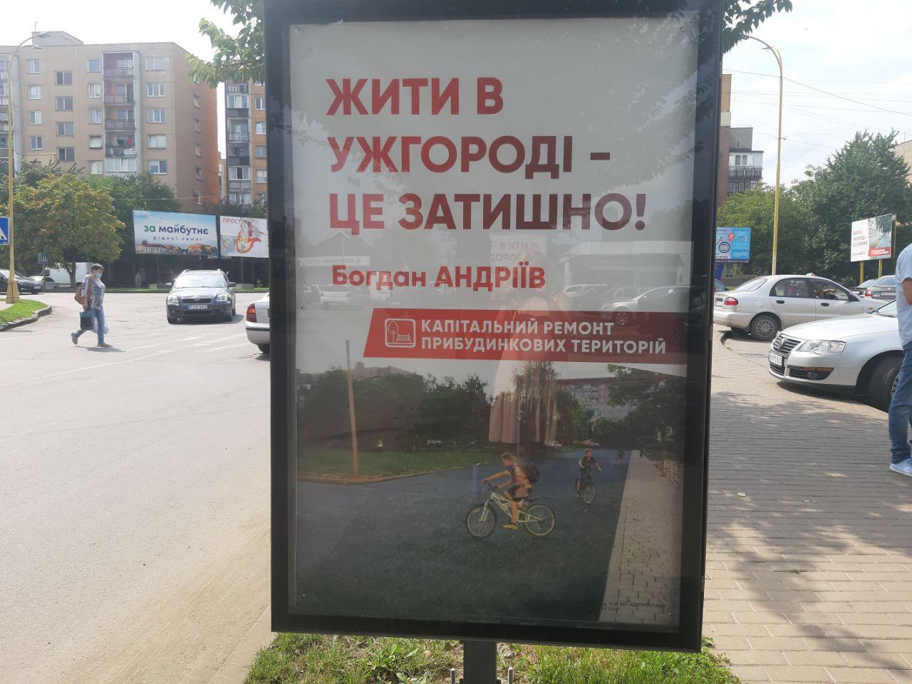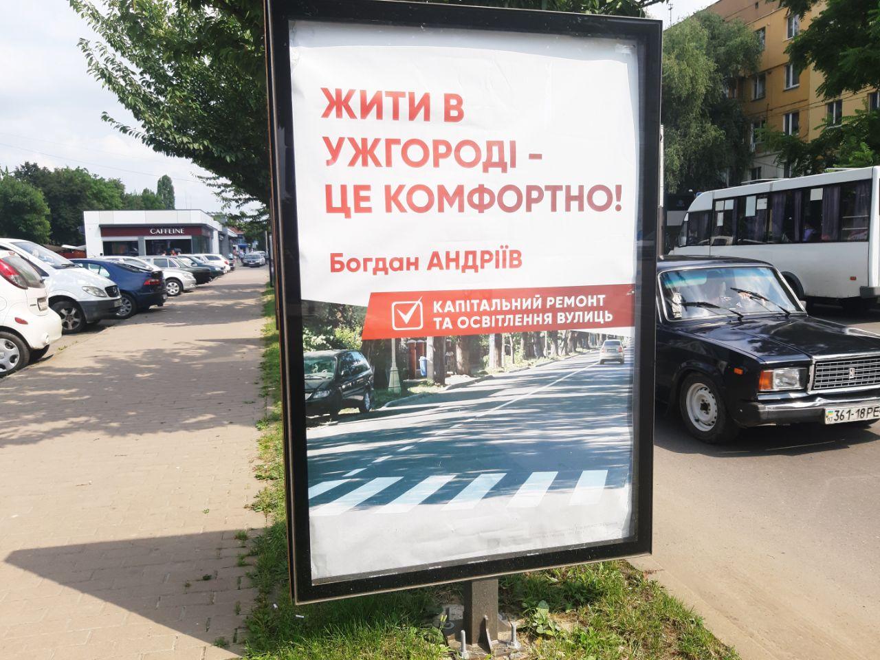 Зокрема, на вулицях міста з'явилися рекламні борди та сітілайти чинного міського голови Ужгорода Богдана Андріїва. На плакатах зображені різні локації міста, на яких провели ремонти чи закуплені активи за кошт міського бюджету упродовж останніх кількох років.