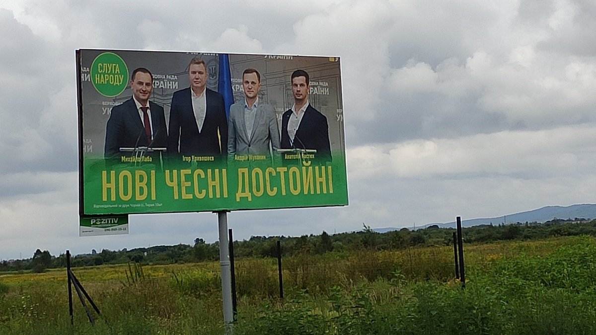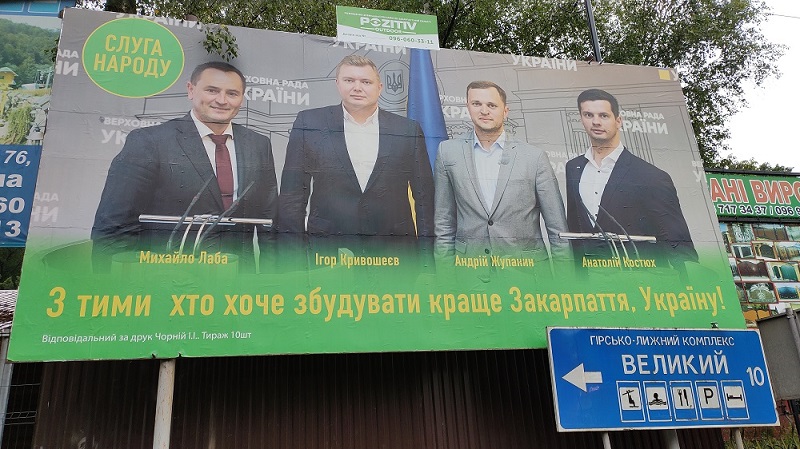 На території Закарпатської області ОПОРА зафіксувала й інші борди «Слуги народу». Наприклад, плакат із написом «Нові, чесні, достойні» та фотографіями трьох політиків, чинних нардепів від партії «Слуга народу» – Михайла Лаби, Ігоря Кривошеєва, Анатолія Костюха та Андрія Жупанина. Згідно з вихідними даними, які є на плакаті, відповідальний за друк – Чорній І. І., тираж – 10 примірників. Борд із фотографіями цих політиків, однак з іншим написом – «З тими, хто хоче збудувати Закарпаття, Україну!» також розміщений у Тячівському районі.