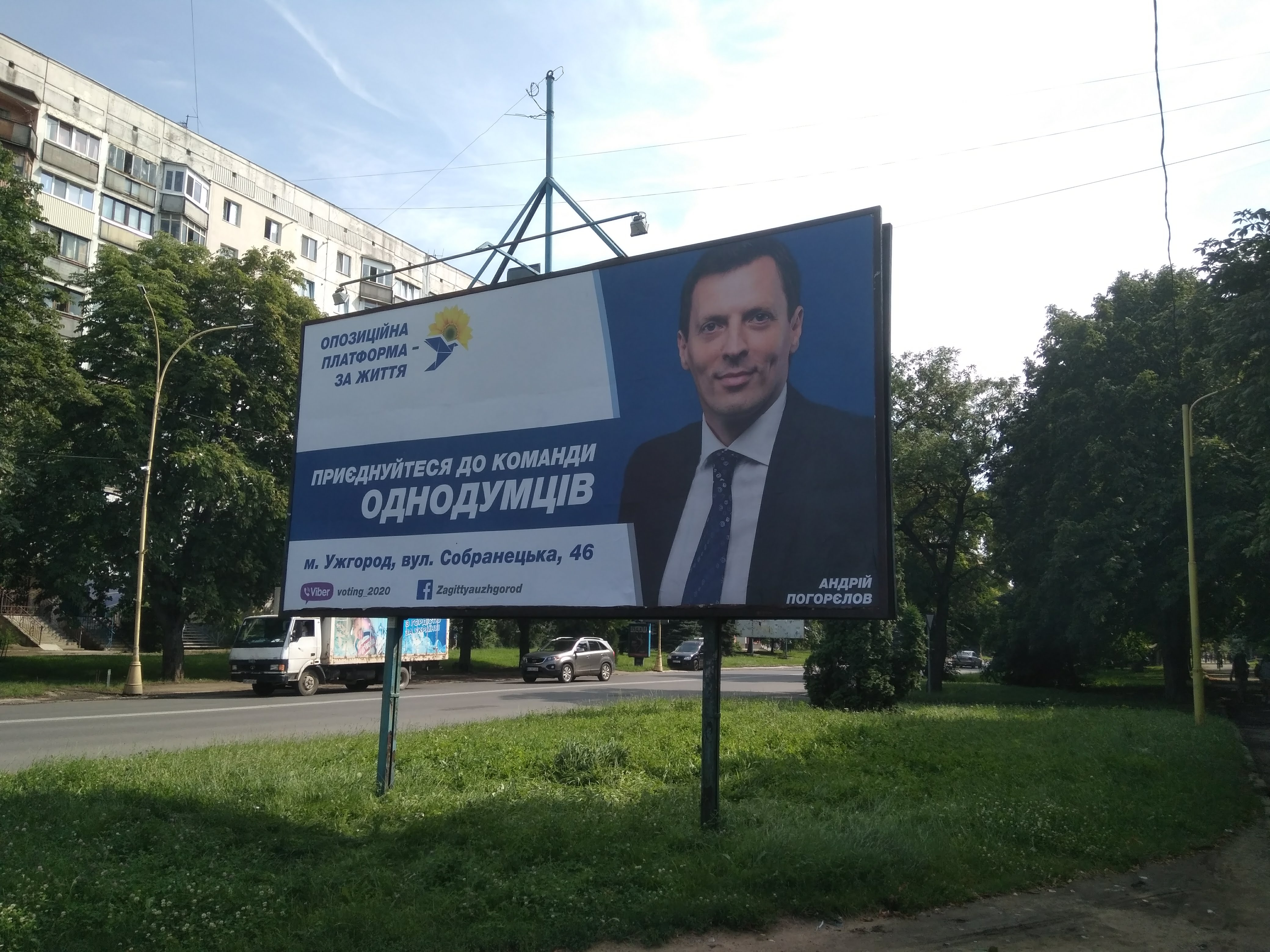 Попри те, що виборчий процес офіційно розпочнеться 5 вересня, упродовж серпня в Ужгороді та інших містах Закарпатської області з’явилися білборди та сітілайти з назвами політичних партій та іменами потенційних кандидатів, які планують брати участь у місцевих виборах 25 жовтня. Оскільки такі білборди до старту виборчої кампанії не вважаються політичною агітацією, вихідних даних, тобто інформації про установу, що здійснила друк, тираж, замовника тощо, на них немає бути, однак на деяких плакатах такі дані присутні.