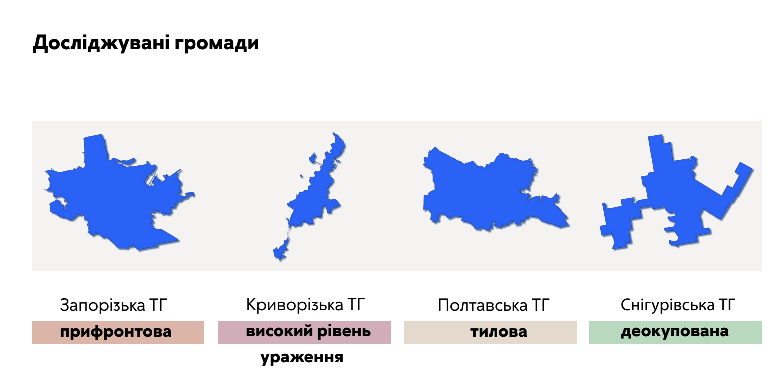 В цьому інтерактивному звіті акумульована інформація про громади різного типу: прифронтова Запорізька міська територіальна громада; Криворізька міська територіальна громада, яка часто зазнає російських атака; тилова Полтавська міська територіальна громада; деокупована Снігурівська міська громада Миколаївської області.