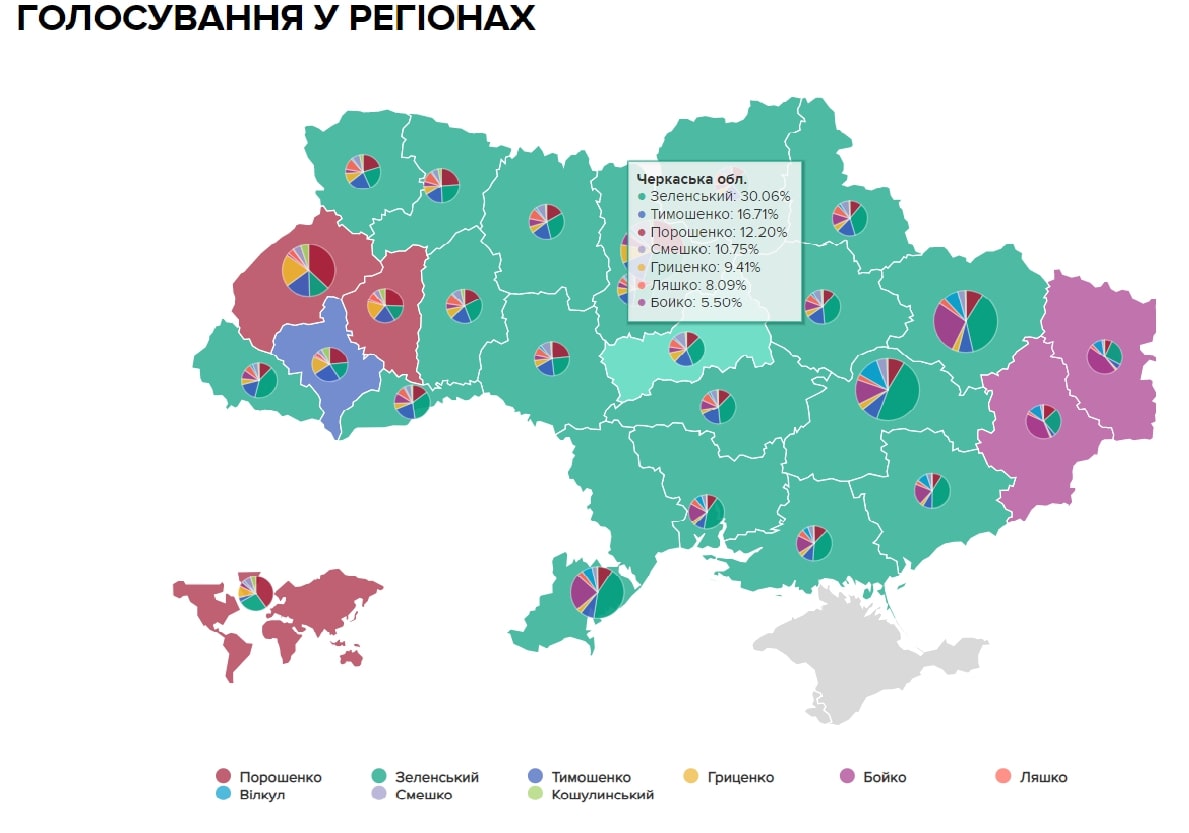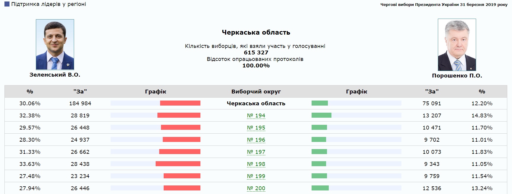 На Черкащині Зеленський переміг у кожному з семи округів, у трьох із них здобувши понад 30%. Найбільше голосів він отримав в округах №194 у Черкасах та №198 (Смілянський, Кам’янський, Черкаський райони).