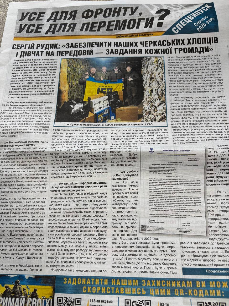 З-поміж прикладів активності чинних політиків можна згадати білборди та газети Сергія Рудика — народного депутата по ВО №198 (депутатська група “Партія ‘За майбутнє’”). У травні минулого року він залишив військо, а вже у вересні 2025-го у Черкасах та Смілі у поштові скриньки жителів прийшов “інформаційний бюлетень” від нього. Газета присвячена здебільшого допомозі Збройним Силам та іншим темам, пов’язаним із війною. Вона містить велике інтерв’ю з Рудиком та інфографіку із порівнянням витрат із бюджетів громад на Сили Оборони і благоустрій. Вказаний тираж — 125 тис. примірників. Також в області з’явилися білборди, промарковані “команда Сергія Рудика”, із закликами підтримувати різні бригади Збройних Сил України.