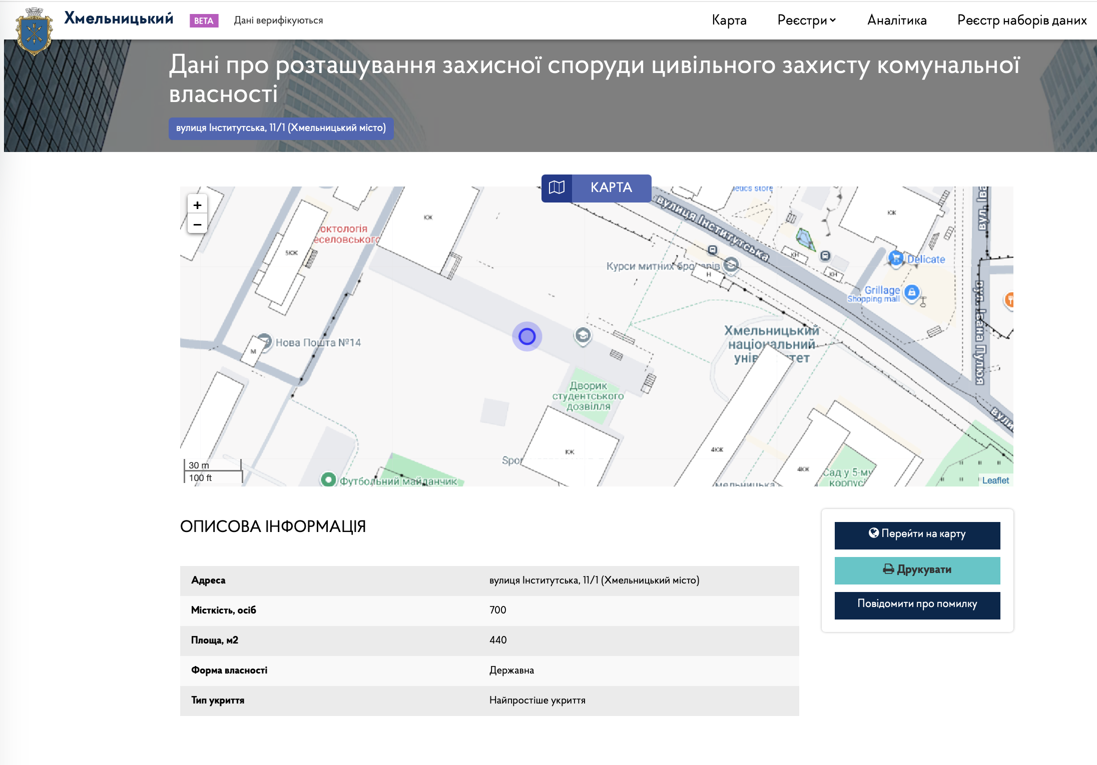 Інформацію про захисні споруди (тип укриття, його адресу, місткість, площу, форму власності) розміщено також на Офіційному геопорталі Хмельницької міської ради.
