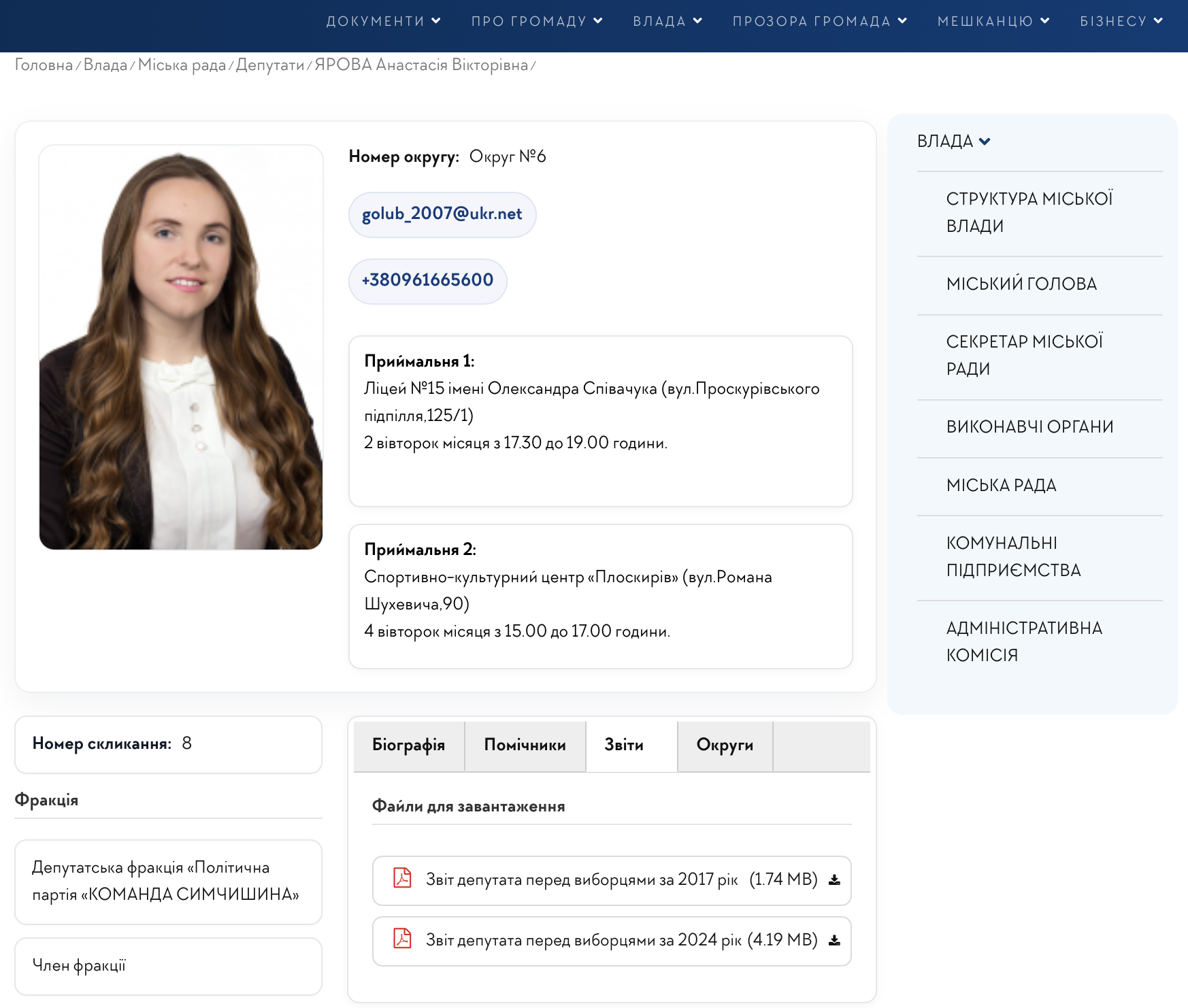 Натомість на сайті Хмельницької міської ради розміщено інформацію про звітування місцевих обранців про роботу в місцевій раді, а в профілях більшості депутатів, окрім контактів приймалень та графіків їх роботи, є також звіт про роботу за 2024 рік.