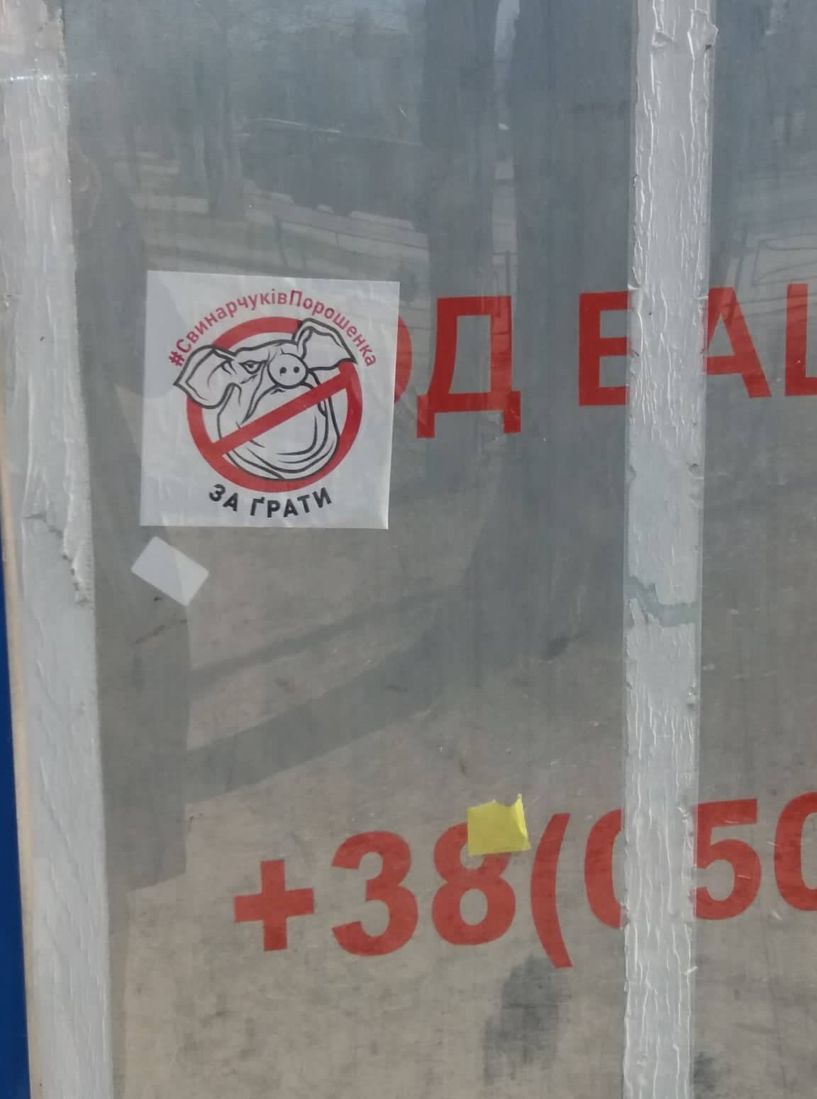 Так, на вулиці Менделєєва було зафіксовано 3 сітілайти, на яких були наклеєні листівки «#Свинарчуків Порошенка за ґрати», зміст яких можна розцінювати як прояв «чорного піару» проти кандидата в Президенти Петра Порошенка. Мова йде про листівки «#Свинарчуків Порошенка за ґрати» - самоклейку розміром приблизно 25 х 25 сантиметри із перекресленим стилізованим зображенням свині та вищезазначеним лозунгом по периметру.
