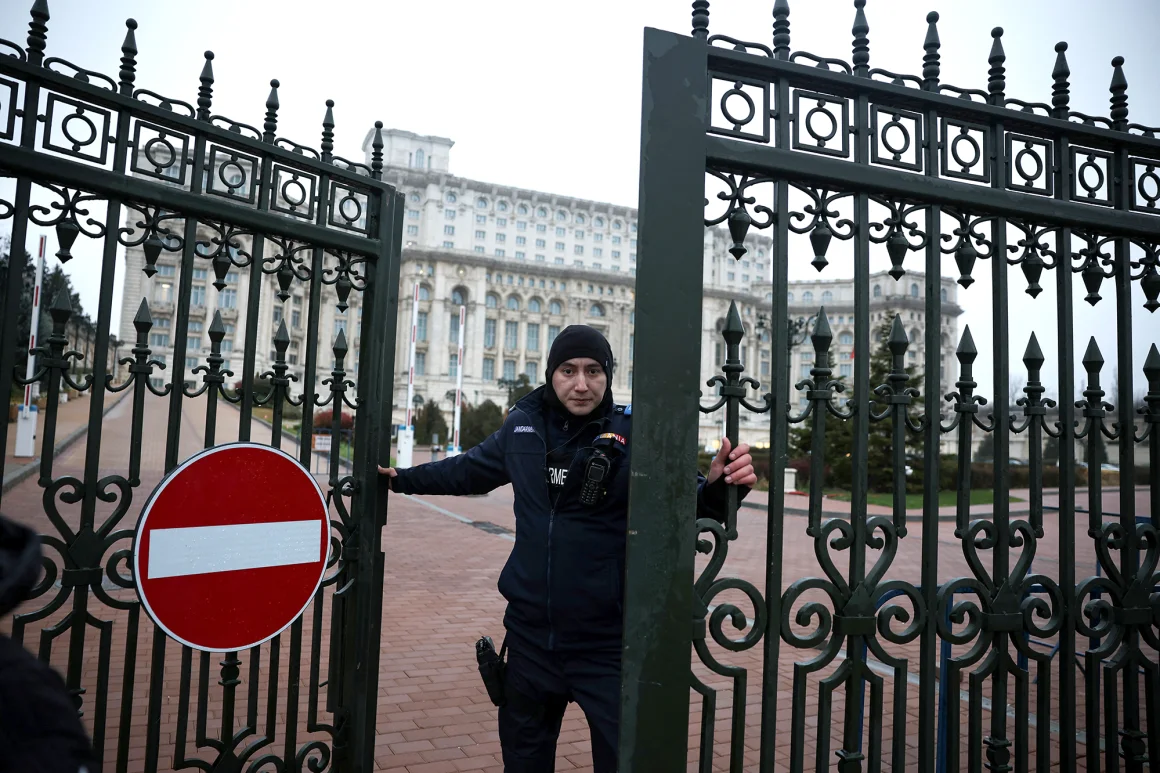Представник жандармерії зачиняє ворота до парламенту після того, як КС Румунії анулював результати першого туру президентських виборів. Джерело