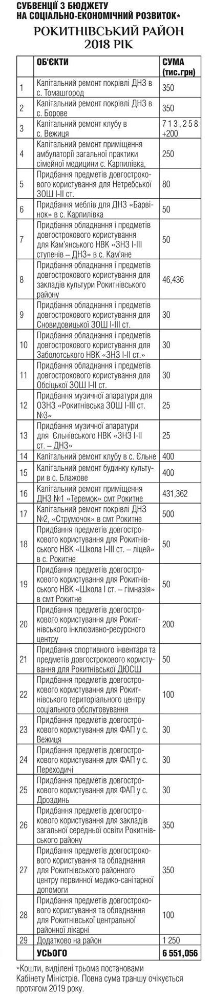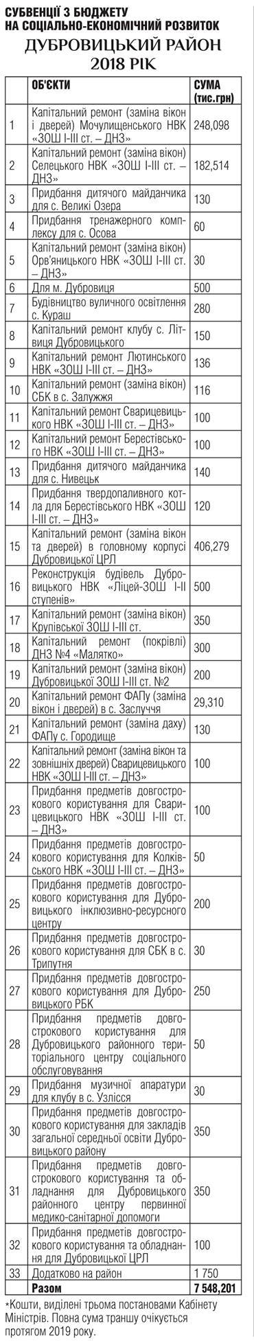 Крім цього, на сторінках вісника розміщена інформація щодо виділених субвенцій з державного бюджету на соціально-економічний розвиток у 2018 році Володимирецького району (загальна сума 5 935 тис. грн), Дубровицького району (сума 7 548,201 тис. грн), Рокитнівського району (6 551,056 тис. грн), Зарічненського району (6 213,927 тис. грн), міста Вараш (2 151,816 тис. грн), ОТГ Висоцьк (700 тис. грн), ОТГ Локниця (700 тис. грн), ОТГ Миляч (700 тис. грн).