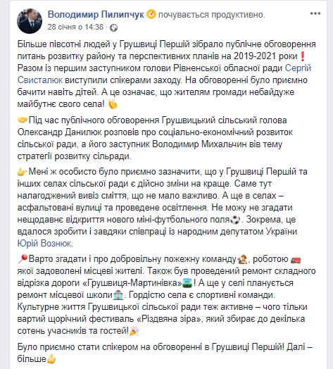 Серед них зафіксований випадок за участі представника державних органів влади. Зокрема, на сторінці у соціальній мережі голови Рівненської районної державної адміністрації Володимира Пилипчука. Зокрема, 28 січня опубліковано новину про візи до Грушвиці Першої. «Не можу не згадати нещодавнє відкриття нового міні-футбольного поля. Зокрема, це вдалося зробити і завдяки співпраці із народним депутатом України Юрієм Вознюком», - йдеться у повідомленні.