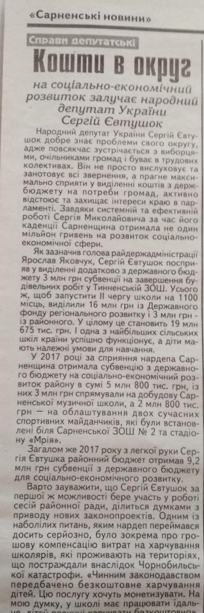 Щодо Сергія Євтушка (ВО «Батьківщина») зафіксовано один ймовірний випадок, коли народний депутат використовував заходи, що оплачені за рахунок державного бюджету, для власного піару. Так, у місцевій газеті «Сарненські новини» опублікована стаття «Кошти в округ на соціально-економічний розвиток залучає народний депутат України Сергій Євтушок». У матеріалі перерахована значна кількість субвенцій, спрямованих на різні напрямки. Крім цього неодноразово зустрічалось, що кошти виділені «завдяки», «за сприяння», «з легкої руки» депутата. Для прикладу: