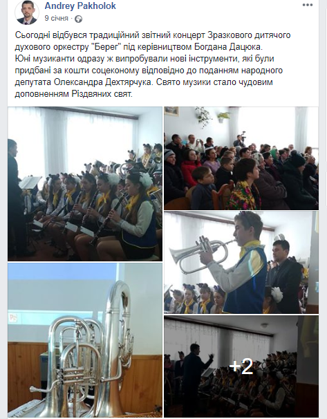 9 січня помічник народного депутата Андрій Пахолок на своїй сторінці у Facebook повідомив про візит на концерт Зразкового дитячого духового оркестру «Берег». «Юні музиканти одразу ж випробували нові інструменти, які були придбані за кошти соцеконому відповідно до поданням народного депутата Олександра Дехтярчука», - йдеться у публікації.