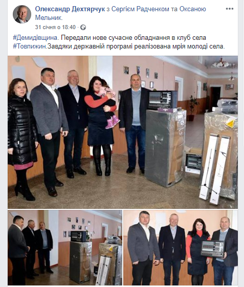 - «Вихованці цього закладу [музичної школи] нещодавно отримали нові музичні інструменти – дев’ять домр та бандуру. Вартість нових інструментів, які придбали коштом субвенції з державного бюджету місцевим бюджетам на здійснення заходів щодо соціально-економічного розвитку окремих територій, отриманої за сприяння Олександра Дехтярчука – 122 тис. грн.»