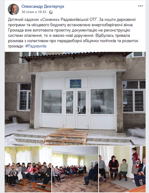 30 січня депутат повідомляє про встановлення енергозберігаючих вікон у дитячому садку «Сонечко» Радивилівської об'єднаної територіальної громади: «За кошти державної програми та місцевого бюджету встановлено енергозберігаючі вікна. Громада вже виготовила проектну документацію на реконструкцію системи опалення, то ж маємо нові доручення».