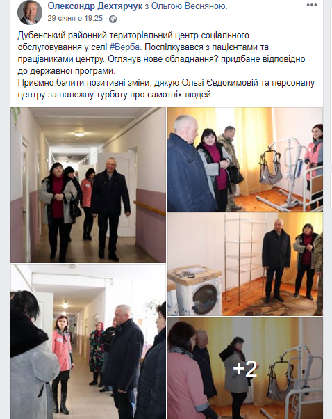 29 січня Олександр Дехтярчук опублікував два повідомлення про візит до Дубенського районного територіального центру соціального обслуговування села Верба і Тараканівської об'єднаної територіальної громади:
