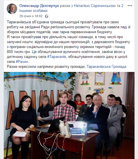 - «Я також прозвітував про діяльність нашої команди, в тому числі про залучені кошти, відповідно до наших пропозицій, з державного бюджету з програми соціально-екомічного розвитку окремих територій - понад 800 тисяч грн. Це облаштування вуличного освітлення, заміна вікон у дитячому садочку села #Тараканів, облаштування нового даху в школі села #Рачин», - зазначає народний депутат.