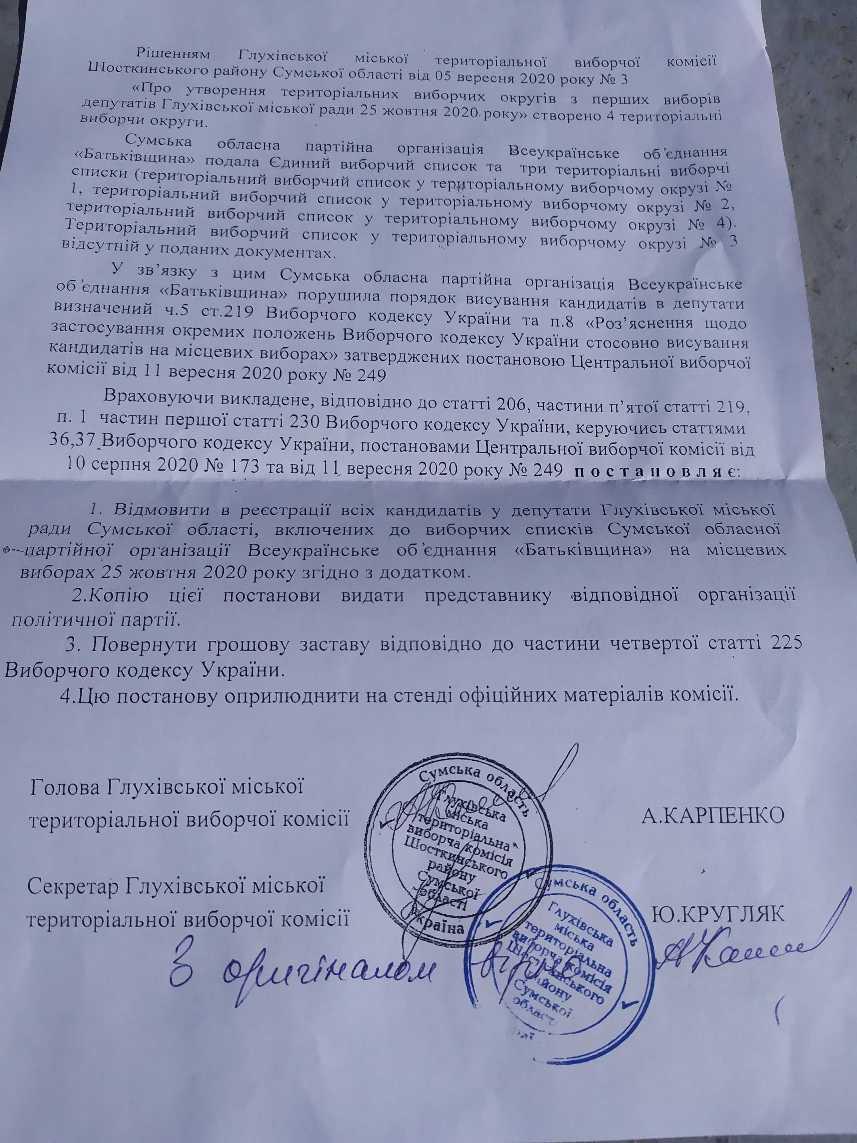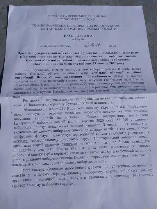 27 вересня Глухівська міська ТВК відмовила у реєстрації кандидатів у депутати Глухівської міської ради Шосткинського району, включених до виборчих списків Сумської обласної партійної організації ВО «Батьківщина». Комісія попередньо утворила 4 територіальні виборчі округи на території громади. Територіальний виборчий список у виборчому окрузі №3 був відсутній у поданих документах від зазначеної партії.