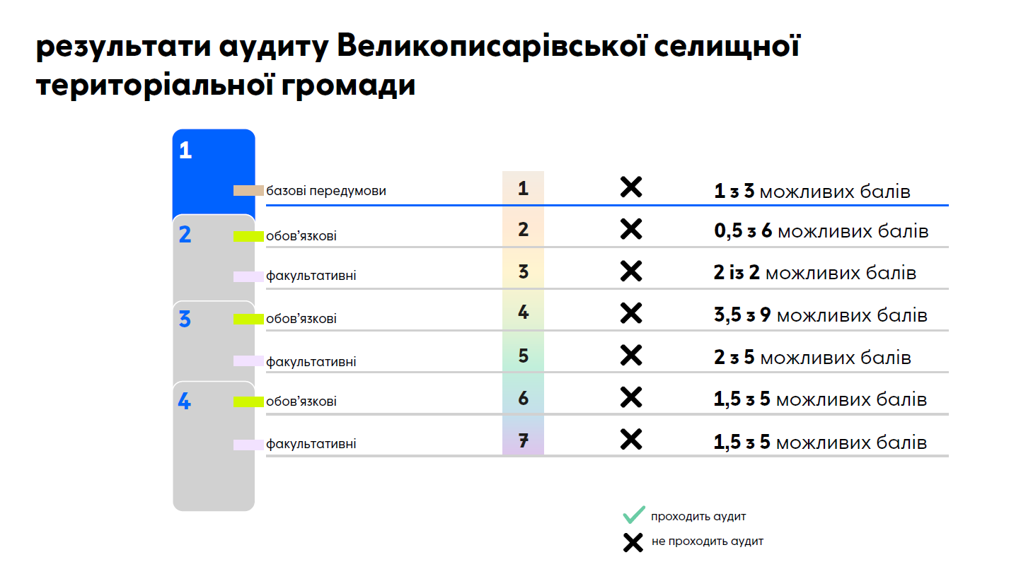 Через безпекову ситуацію та значні руйнування Великописарівська громада набрала лише 12 із 35 можливих балів та не пройшла аудит безпеки за жодним із чотирьох ключових блоків дослідження. Про це 18 грудня під час онлайн-презентації дослідження розповіла регіональна консультантка ОПОРИ в Сумській області Ольга Коренєва.