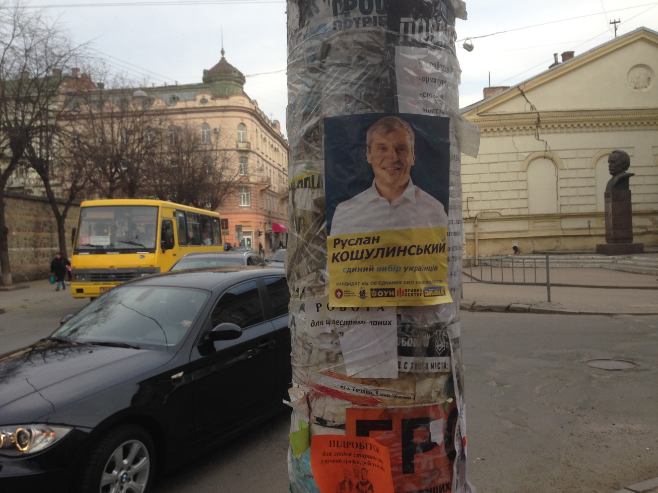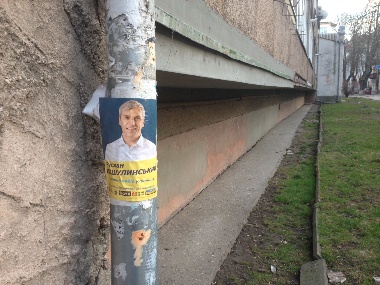 Спостерігачі ОПОРИ у другій половині березня зафіксували у Івано-Франківську масову друковану агітацію за кандидата Руслана Кошулинського, розміщену у не встановлених для цього місцях: на електроопорах, фасадах будинків, стічних трубах, зупинках громадського транспорту тощо. Друкована агітація із зображенням та згадкою імені Руслана Кошулинського станом на 28.03 і досі залишається висіти у невідповідних місцях у різних районах Івано-Франківська.