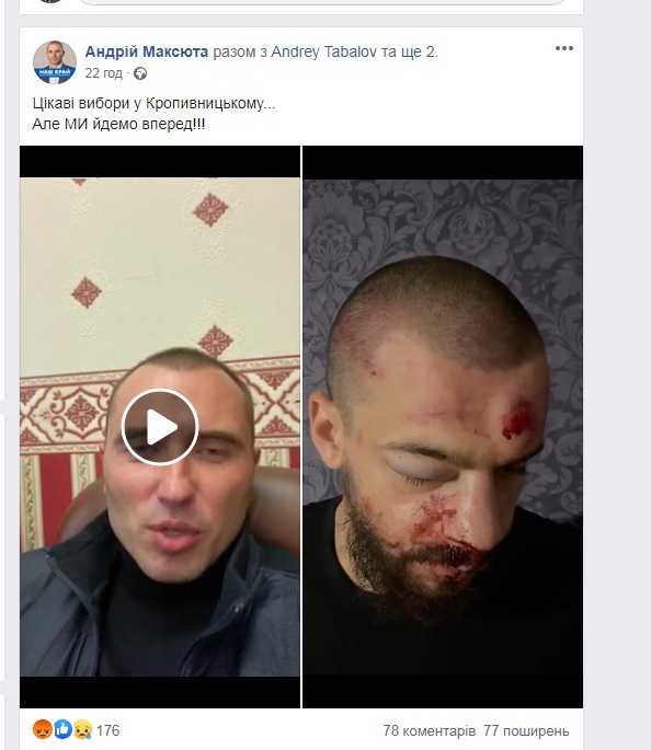 «Під час побиття нападники повідомили про мету злочину – залякати кандидата на посаду міського голови Кропивницького від «Нашого краю» Андрія Максюту. Як зазначає Богдан Голубничий, коли його забивали ногами, йому дослівно сказали «передати привіт Максюті». Лікарі діагностували у Богдана Голубничого числені забиття, зламаний ніс та черепно-мозкову травму. «Наш край» розцінює цей напад як тиск політичних опонентів на кандидатів від партії», – зазначено в заяві політсили.