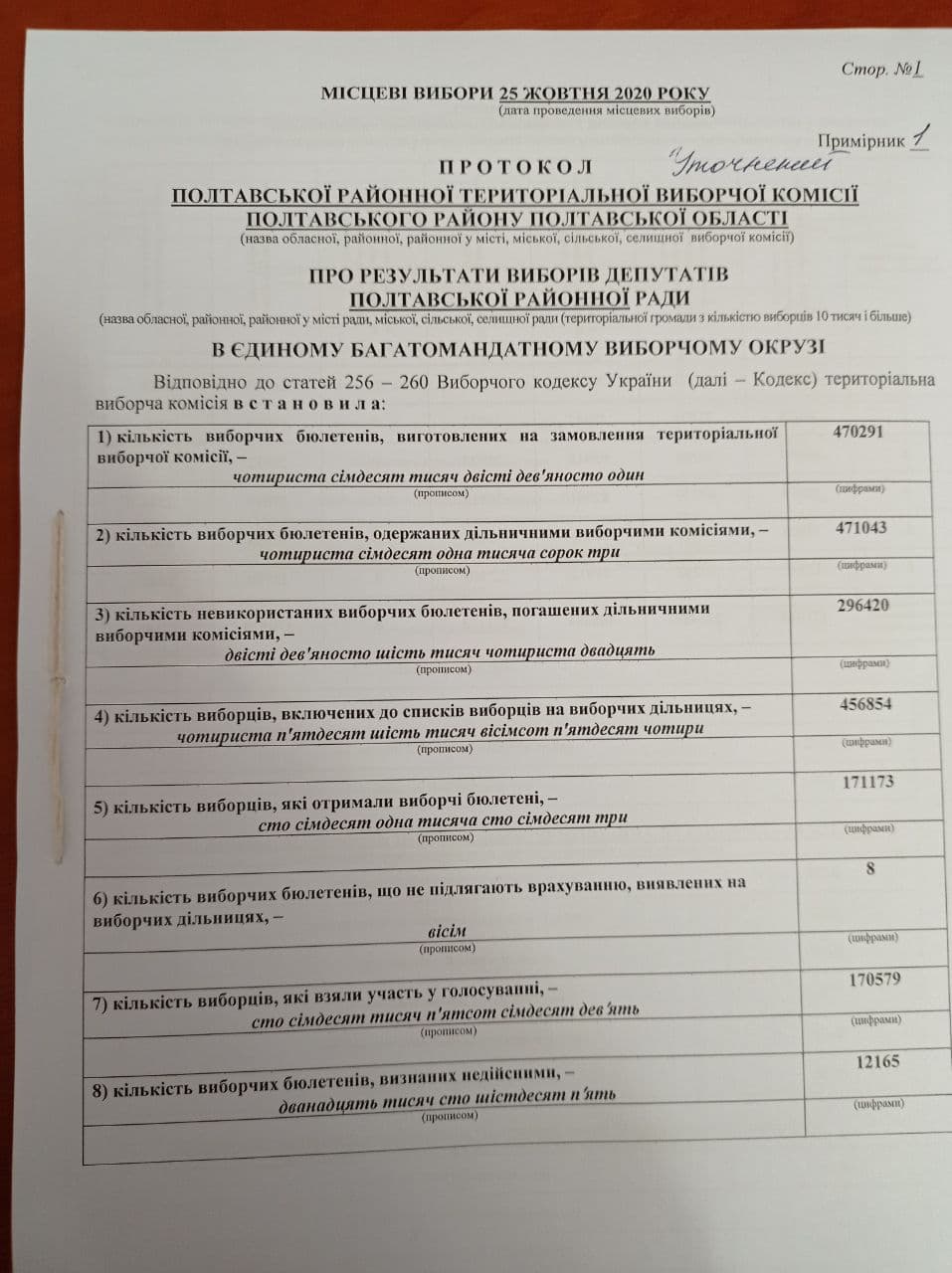 Координатор спостереження Громадянської мережі ОПОРА за виборами у Полтавській області говорить: «Згідно із ч. 3 ст. 260 Виборчого кодексу для визначення кількості мандатів, отриманих єдиним виборчим списком кандидатів від організації партії, загальна кількість невикористаних голосів виборців, поданих у єдиному багатомандатному окрузі на підтримку єдиного виборчого списку кандидатів від відповідної організації партії, визначена відповідно до ч. 2 цієї статті, ділиться на виборчу квоту, визначену відповідно до ч. 3 ст. 257 Виборчого Кодексу. Ціла частина отриманої частки становить кількість депутатських мандатів, яку отримали кандидати у депутати, включені до відповідного єдиного виборчого списку від цієї організації партії».