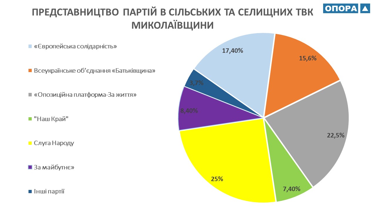 Загалом представництво у виборчих комісіях мають 10 політичних партій. Найбільше представництво в сільських та селищних виборчих комісіях Миколаївщини мають шість партій: «Слуга народу» − 25% від загальної кількості представлених партій, «Опозиційна платформа-За життя» − 22,5%, «Європейська солідарність» − 17,4%, ВО «Батьківщина» − 15,6%, «За Майбутнє» − 8,4%, «Наш край» − 7,4%.