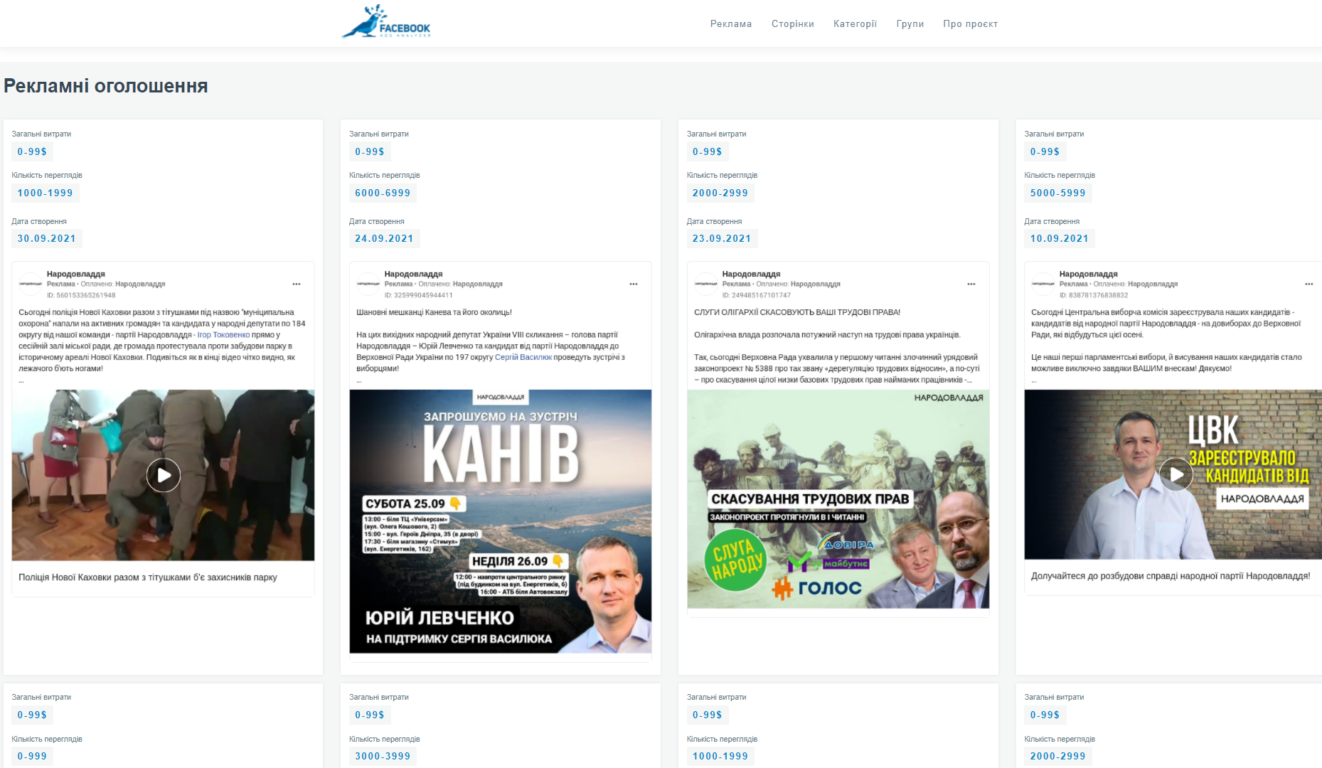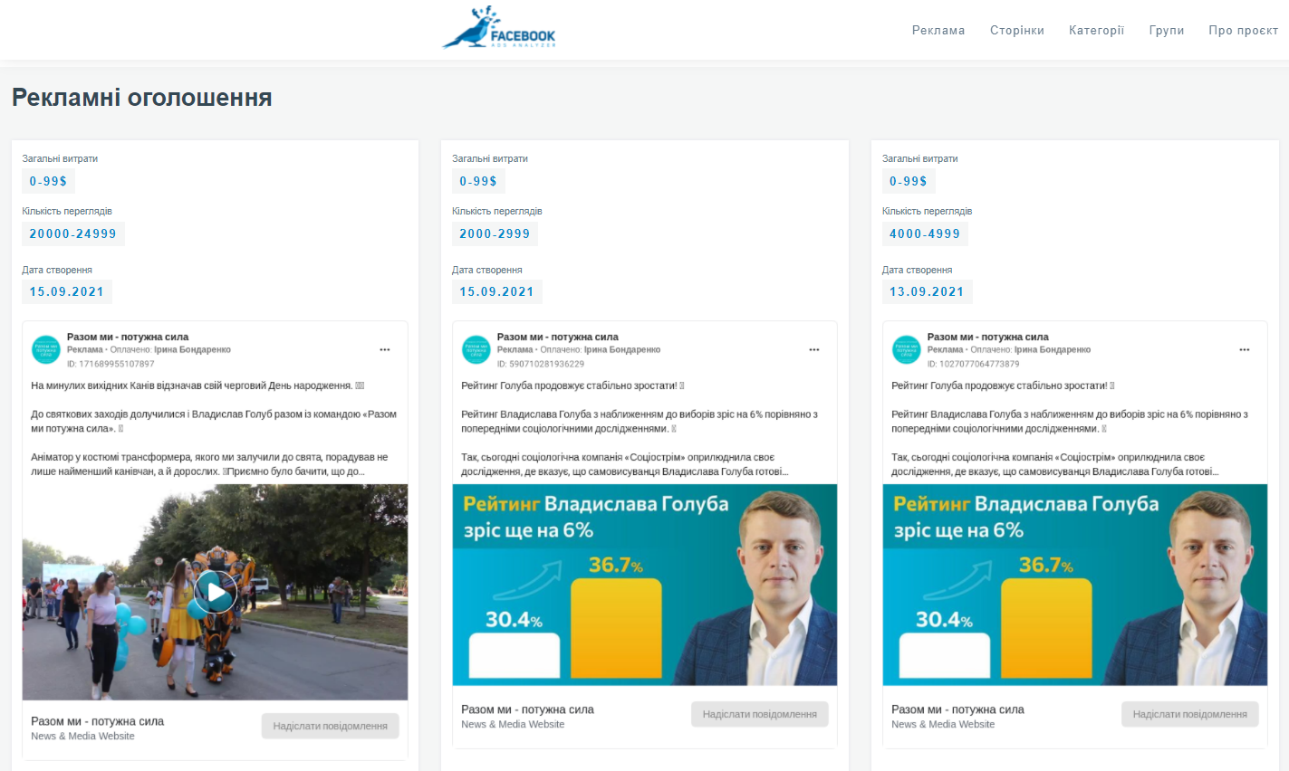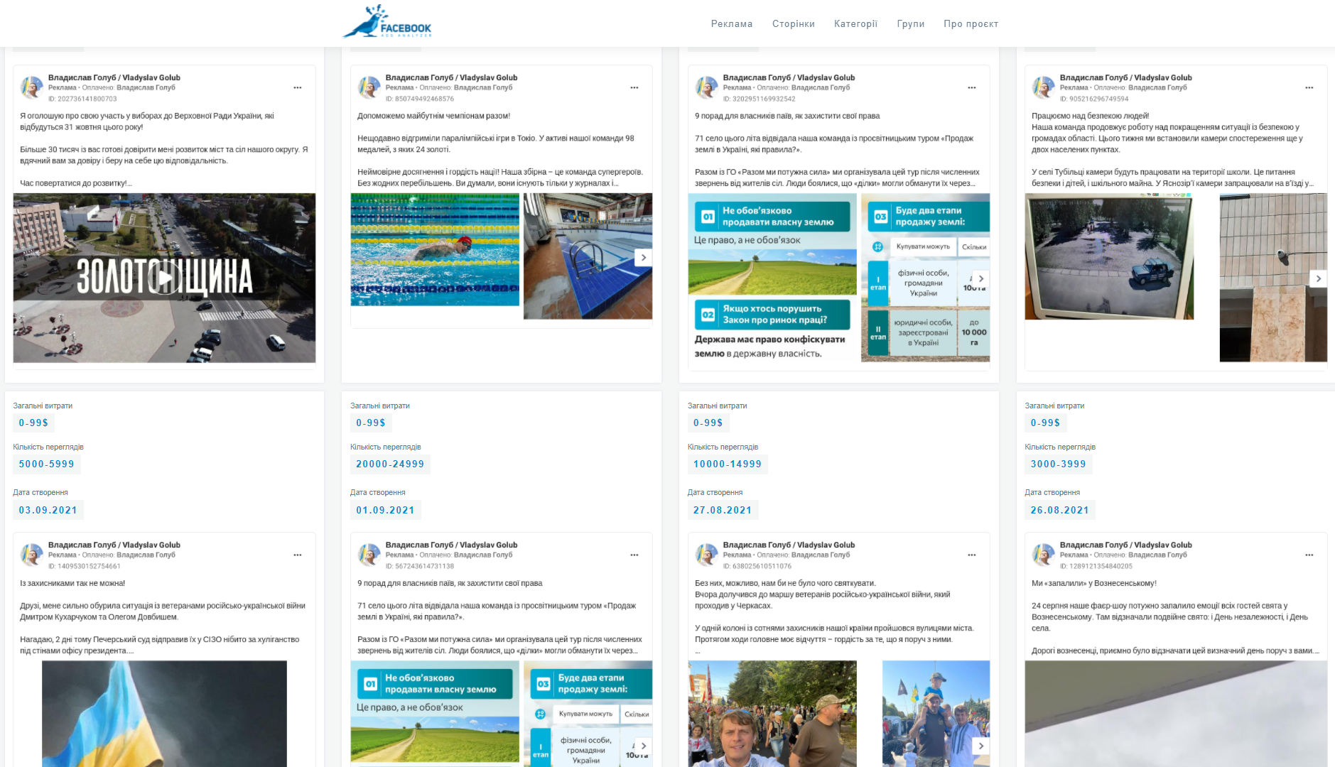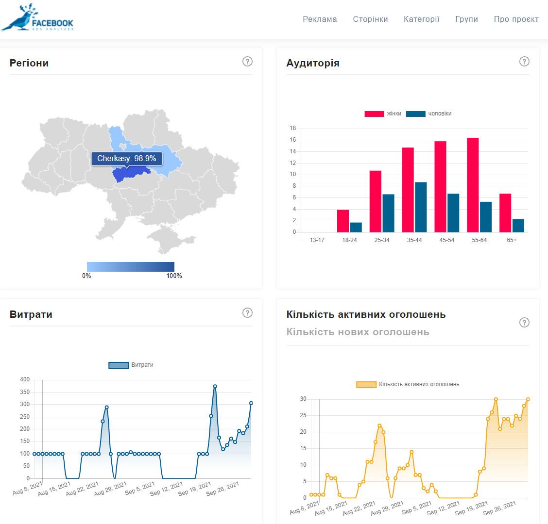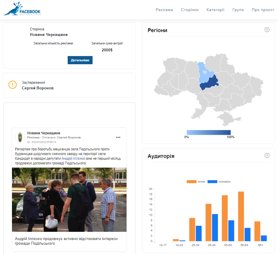 У вересні для користувачів із Черкащини політична реклама транслювалася з 41 фейсбук-сторінки. Значна частина промотованого контенту, а це майже 300 оплачених публікацій, була орієнтовна на потенційних виборців – мешканців громад 197 округу, де восени відбудуться проміжні вибори до Верховної Ради.