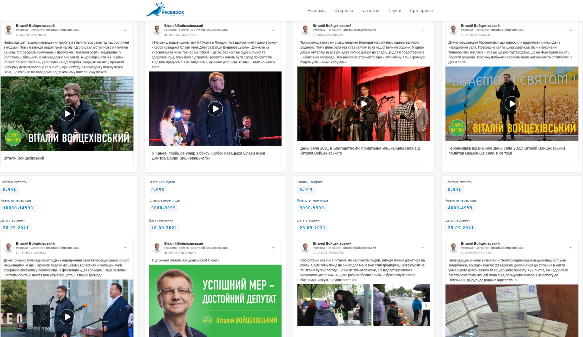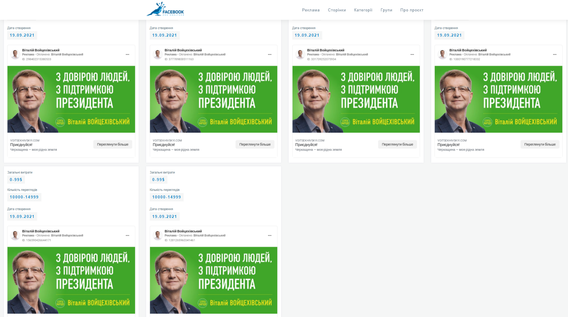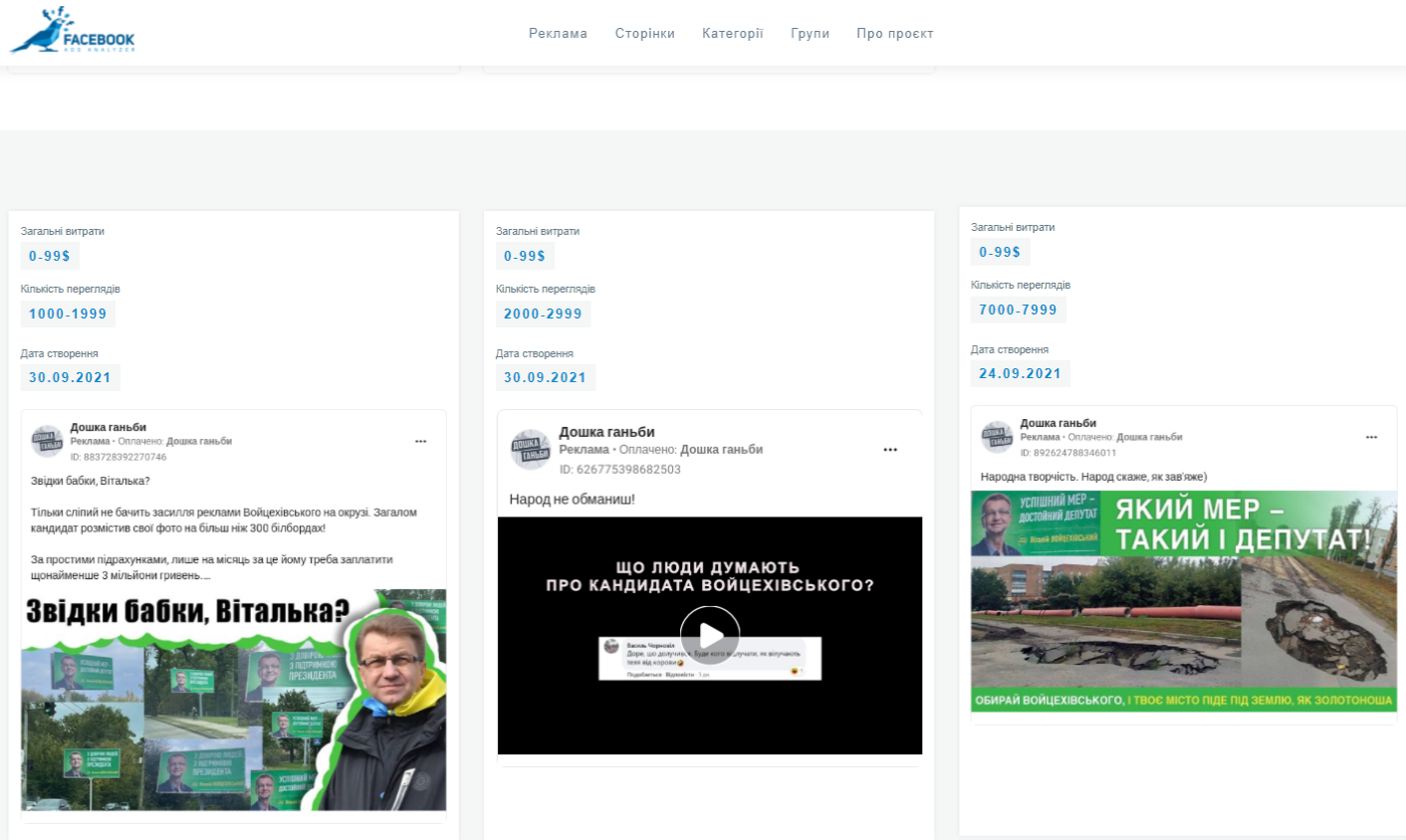 Водночас наприкінці вересня у мережі було поширено три реклами із ознаками «чорного піару» та дискредитації щодо Віталія Войцехівського зі сторінки Дошка Ганьби (створена 23 вересня 2021 року). Відповідно до даних, які рекламодавець надав Facebook, оплачує рекламу — Дошка ганьби, сторінка віднесена до категорії Новини та ЗМІ, але зазначений сайт — недоступний.