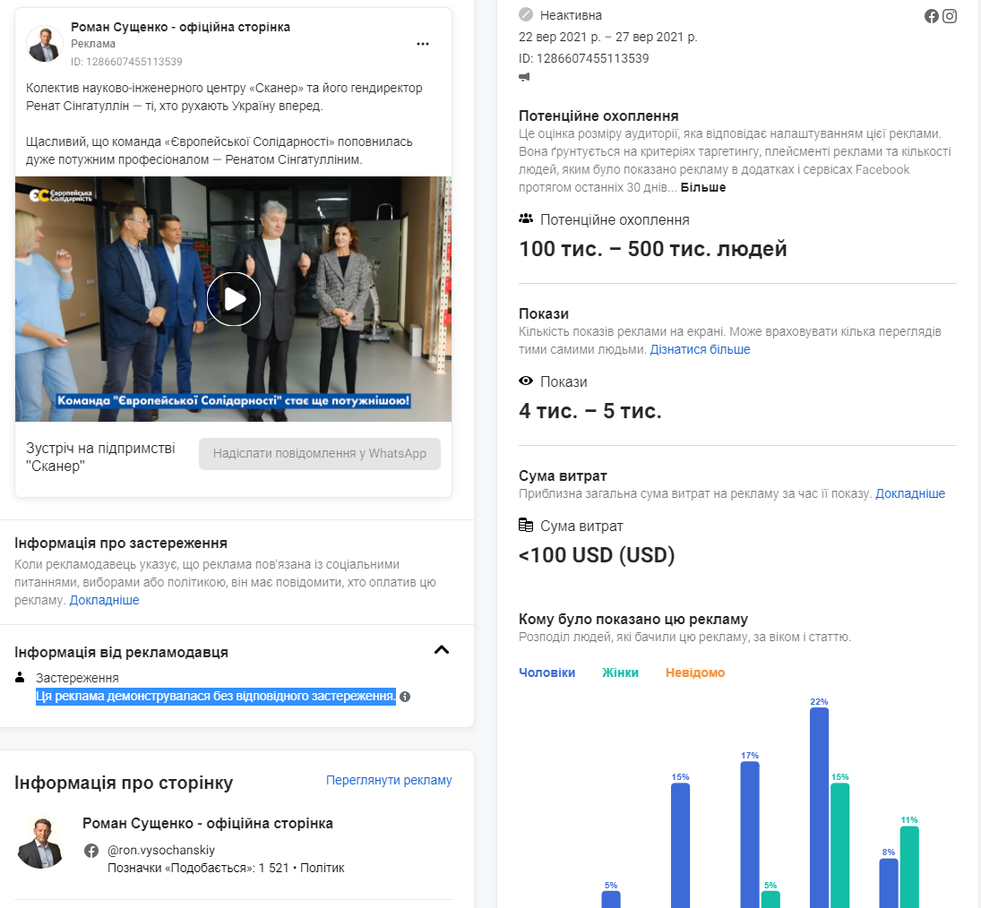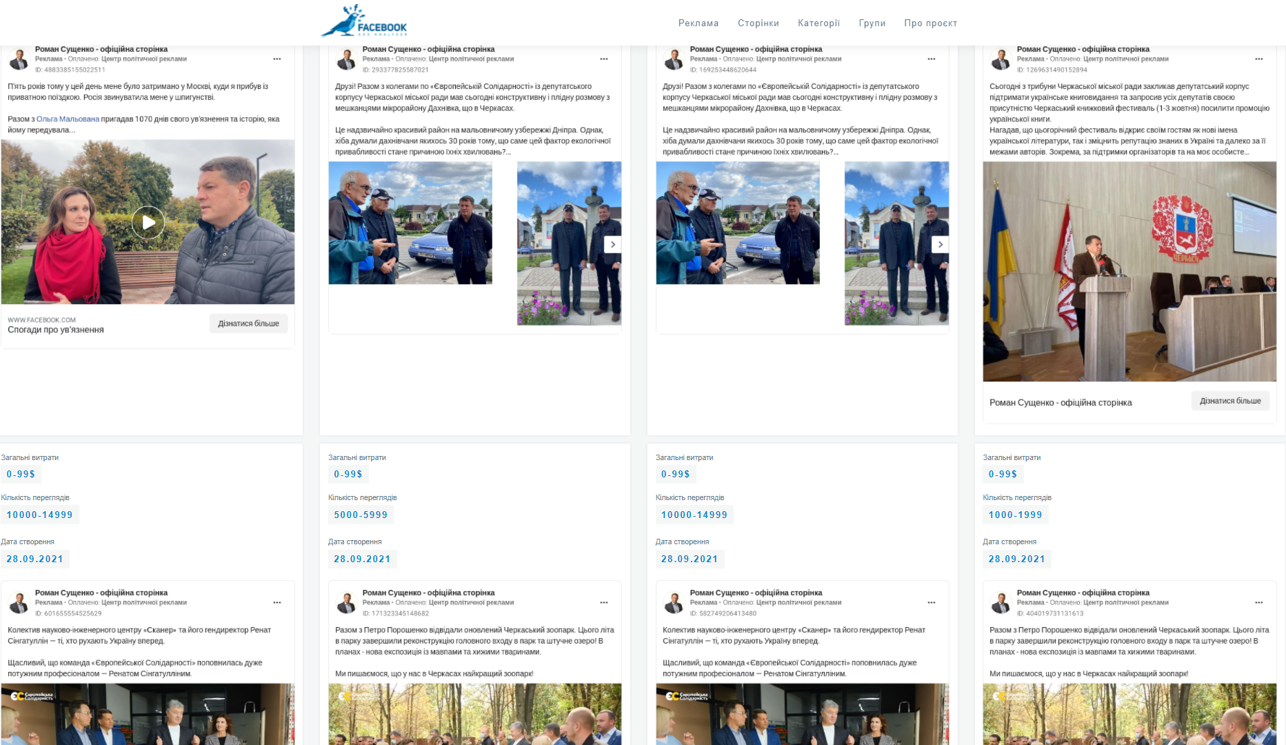 11 реклам транслювалося на сторінці кандидата від «Європейська Солідарність» Романа Сущенка (зареєстрований 17 вересня). Всі ці пости були опубліковані після 22 вересня, а коштували менше 100 відповідно. Рекламу оплачує Центр політичної реклами, ця ж установа є рекламодавцем на сторінці Василя Авраменка, кандидата на посаду голови Липовецької громади (Вінничина), де вибори теж будуть 31 жовтня. При цьому одна реклама на сторінці демонструвалася без відповідного застереження. Також загадується кандидат у щонайменше 7 рекламованих відео з YouTube-каналу на сторінці медіахаб Черкаси NOW.