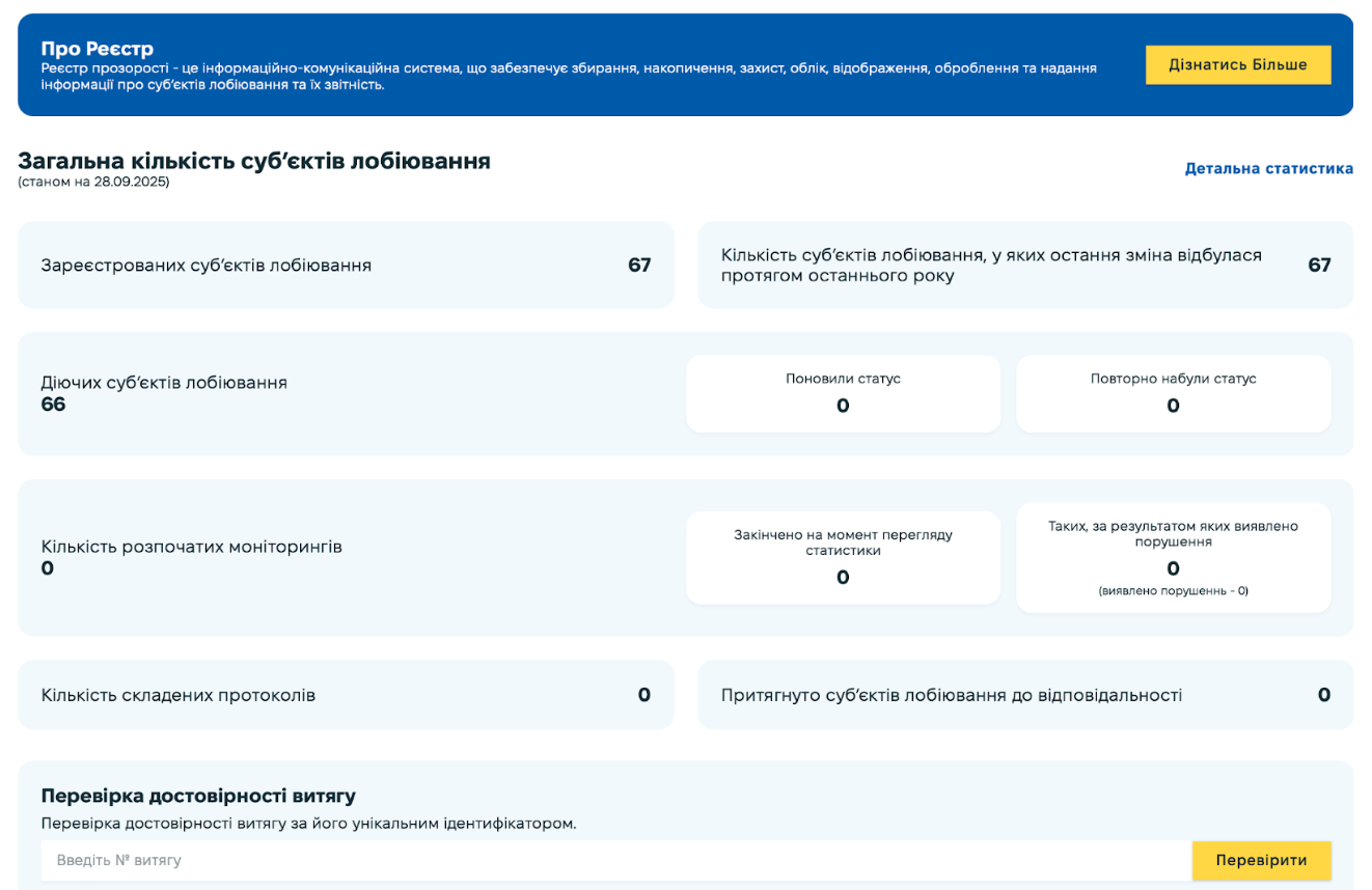 Детальніше статус Реєстру прозорості регламентований ст. 5 Закону, а внесені до нього публічні дані та інструкції щодо реєстрації розміщені на сайті НАЗК.