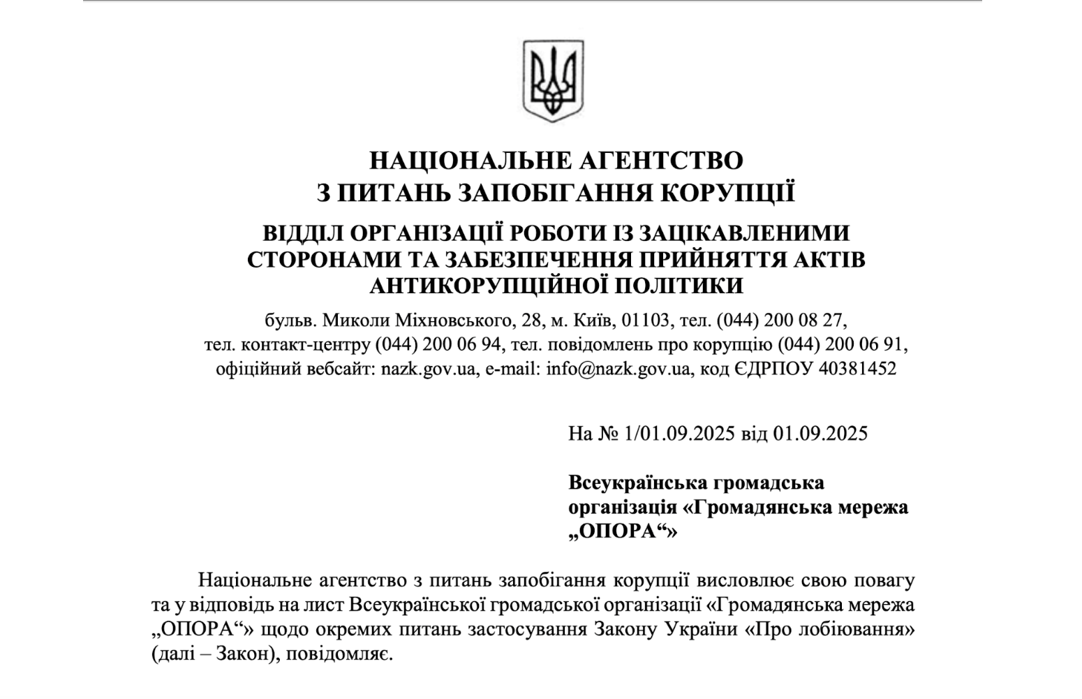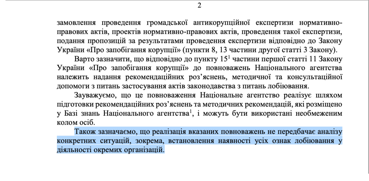 Своєю чергою у відповіді на запит ОПОРИ НАЗК фактично продублювало п. 8 ч. 2 ст. 3 Закону, зазначивши: “... не є лобіюванням діяльність, що не містить всіх ознак лобіювання, зокрема, діяльність громадських об’єднань, інших неприбуткових підприємств, установ та організацій, що спрямована на вплив (спробу впливу) на суб’єктів владних повноважень (органи державної влади, інші державні органи, органи місцевого самоврядування, юридичні особи публічного права, наділені владними повноваженнями, їх посадових осіб) з метою прийняття або утримання від прийняття такими суб’єктами рішень, що віднесені до їхніх повноважень, крім випадків, якщо така діяльність стосується комерційних інтересів”.