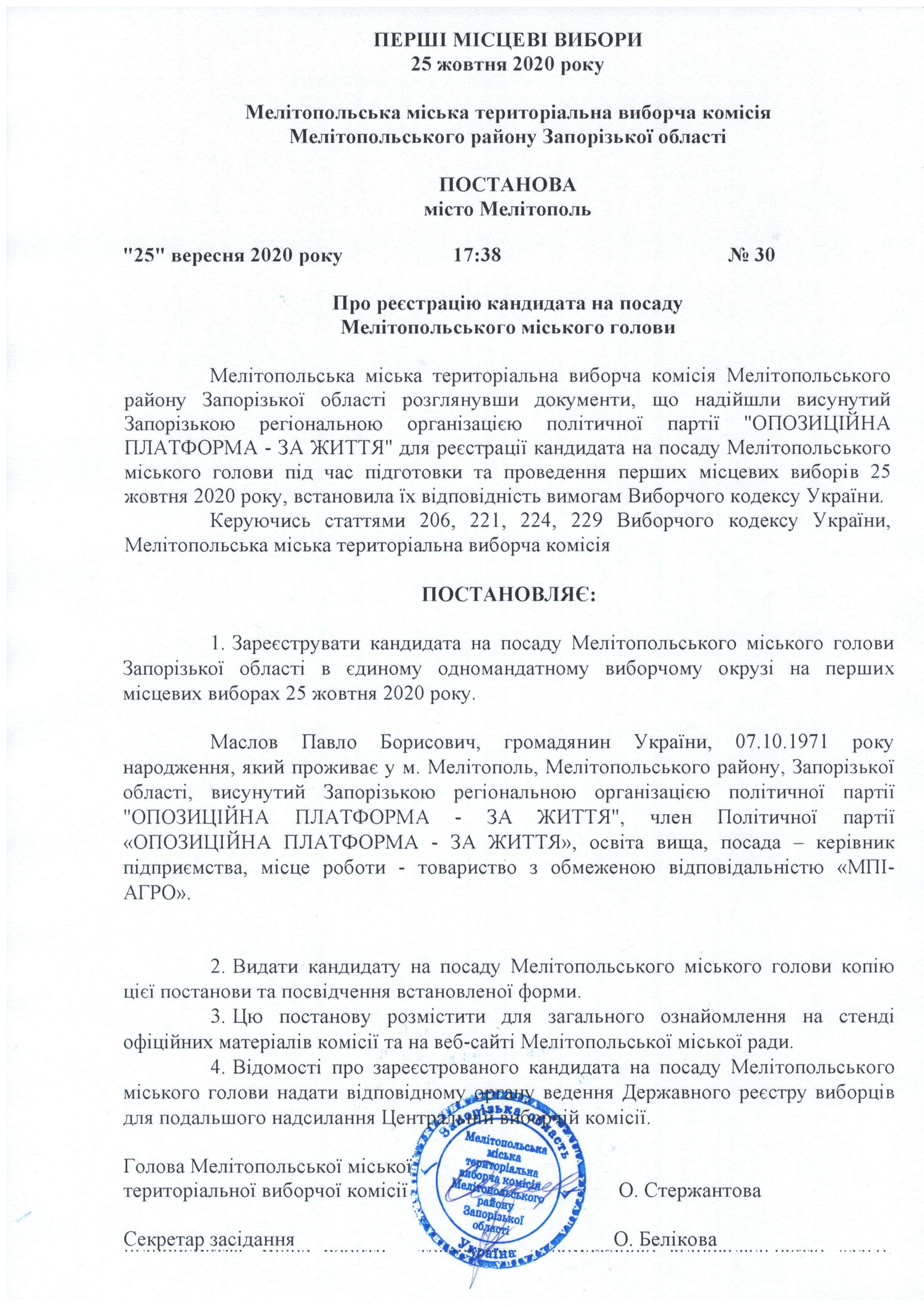 Так, згідно з постановою №30 від 25 вересня 2020 року, 17:38, Мелітопольська міська територіальна виборча комісія зареєструвала Павла Борисовича Маслова як кандидата на посаду Мелітопольського міського голови Запорізької області від політичної партії «Опозиційна платформа – за життя» в єдиному одномандатному виборчому окрузі на перших місцевих виборах 25 жовтня 2020 року.
