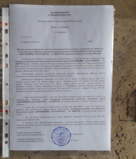 У той час згідно з постановою №34 від 25 вересня, 17 год. 53 хв., Запорізька обласна територіально виборча комісія зареєструвала кандидатів у депутати Запорізької обласної ради, включених до єдиного та територіальних виборчих списків Запорізької регіональної організації Політичної партії «Опозиційна платформа – за життя» в територіальній виборчій комісії. У цьому переліку кандидатів під порядковим номером 42 в єдиному виборчому списку зареєстрований Павло Борисович Маслов, якого віднесено до територіального виборчого округу №7.
