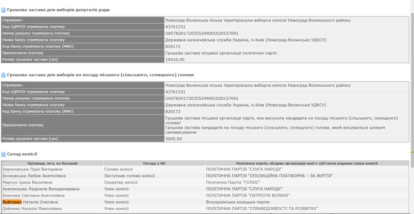 Голова Новоград-Волинської міської ТВК Лідія Барановська розповіла ОПОРІ, що комісія не мала підстав не зареєструвати Наталію Войтович кандидаткою. Нині ж вона не відвідує засідання комісії і її повноваження, як членкині ТВК, припинені.