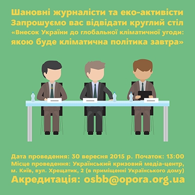 У середу, 30 вересня, о 13.00 у Києві відбудеться обговорення (круглий стіл) на тему: «Внесок України до глобальної кліматичної угоди: якою буде кліматична політика завтра».