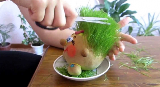 «Для виготовлення «трав’яничка» потрібно змішати тирсу з насінням трави та наповнити сумішшю капронову панчоху, після чого розмалювати. Упродовж тижня іграшку треба поливати щоденно, поки не проросте трава», – розповідає Аліна Брезіцька.