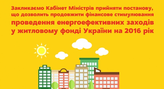 З огляду на це, Громадянська мережа ОПОРА закликає Кабінет Міністрів України прийняти постанову «Про продовження строку виконання Державної цільової економічної програми енергоефективності і розвитку сфери виробництва енергоносіїв з відновлюваних джерел енергії та альтернативних видів палива на 2010-2015 роки», що дозволить продовжити фінансове стимулювання проведення енергоефективних заходів у житловому фонді України на 2016 рік.