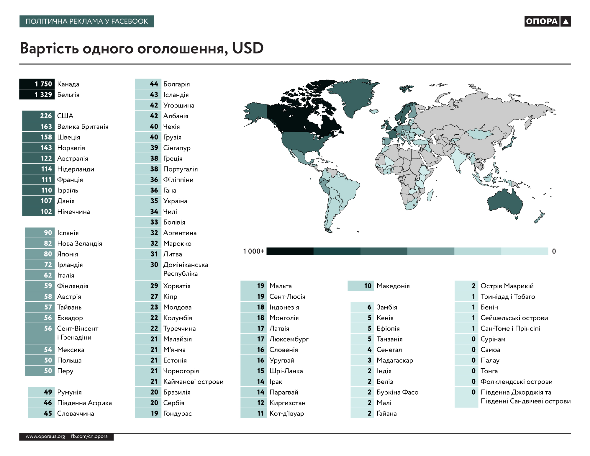 Друге місце — за Бельгією, де рекламодавець буде змушений віддати майже 1500 доларів за одну рекламу. Натомість у США вартість одного рекламного допису становить менше 250 доларів. В Україні один політичний рекламний допис у середньому коштує лише близько 35 доларів.