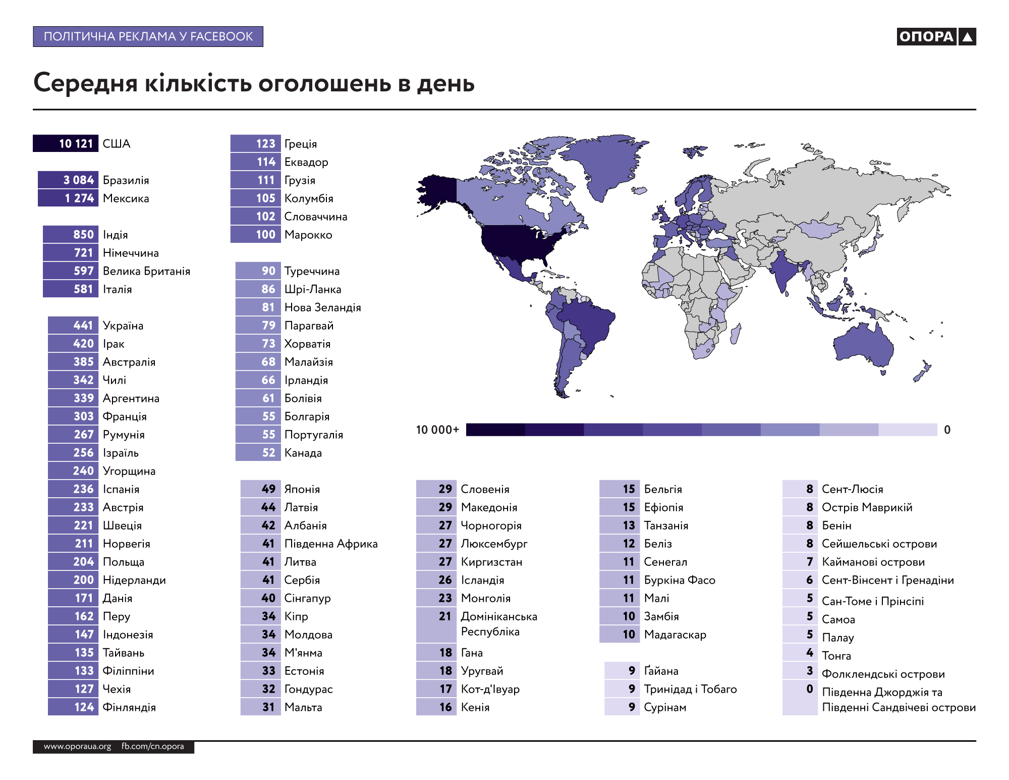 Нижче спробуємо проаналізувати, як до можливостей просування через політичну рекламу ставляться у країнах, де публікують найбільше рекламних дописів на день.