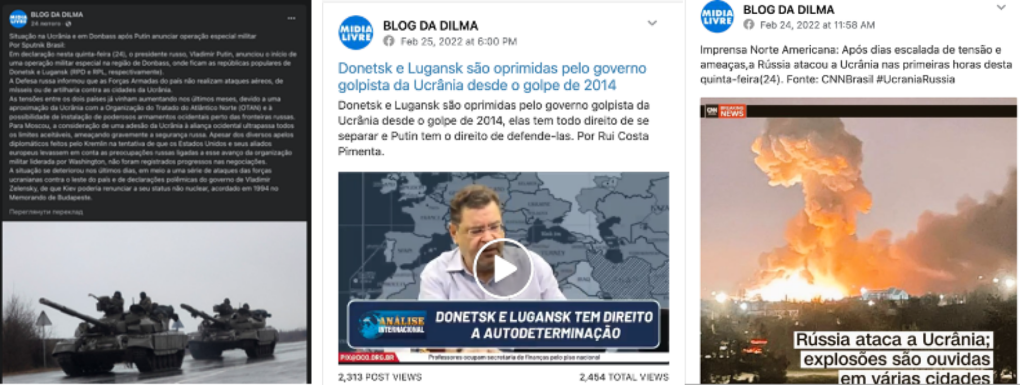 Варто детальніше розглянути 5 сторінок, які набрали найбільшу кількість взаємодій користувачів із 24 лютого 2022 року. Найпопулярніша сторінка, що поширювала контент проросійських вебсайтів, — португальське опозиційне медіа “Blog Da Dilma” (425 тисяч підписників). Більшість контенту стосується місцевої політики — восени у Бразилії відбудуться чергові вибори, тож адміністраторів більше цікавить критика чинного президента Жаїра Болсонару, ніж війна в Україні. Однак час від часу вони публікують дописи і про Україну. Сторінка не має принципової позиції щодо України: в одних публікаціях вона критикує росію за воєнну агресію, а в інших — публікує проросійські наративи, наприклад, репостить дописи російського прорежимного медіа Sputnik.