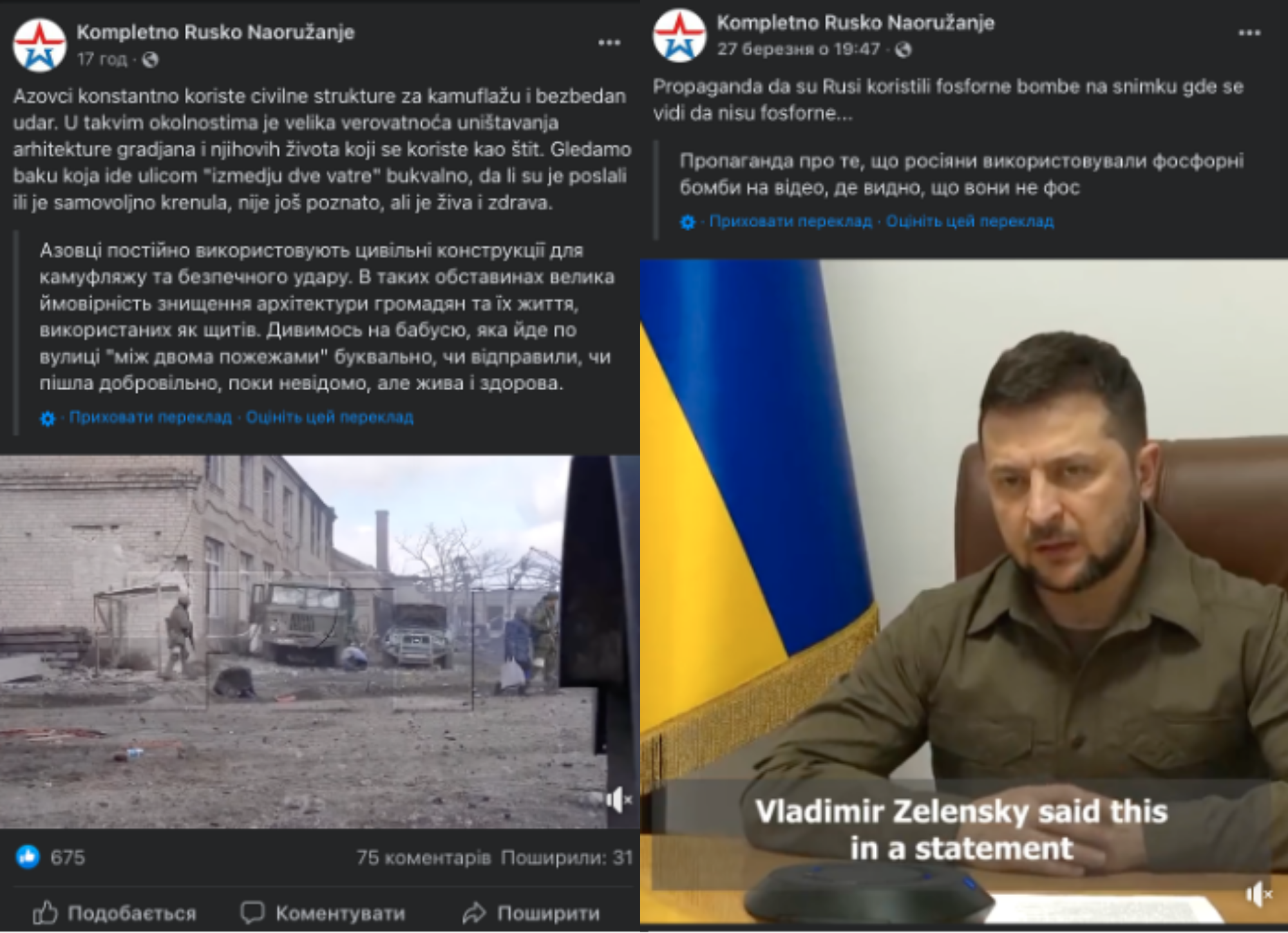 Наступна сторінка — боснійська Kompletno Rusko Naoružanje (понад 70 тисяч підписників). Вона створена у 2014 році і, відповідно до опису, має на меті інформування про збройні сили рф. Один з адміністраторів сторінки — користувач з України. Від початку війни сторінка публікує російські пропагандистські меседжі — наприклад, що рф “звільняє Маріуполь від нацистів з Азову”.