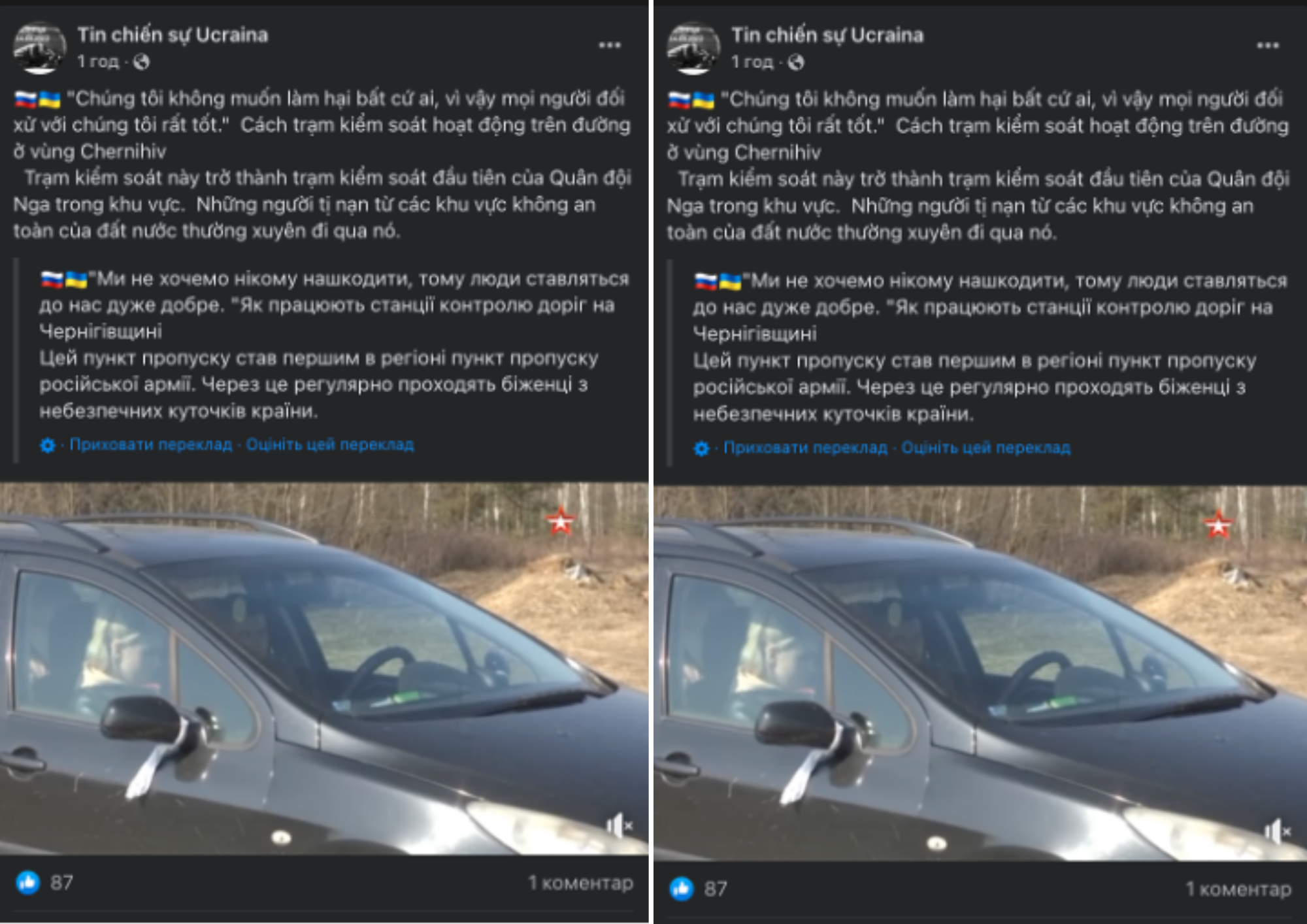 Четверта сторінка — знову в’єтнамська. Tin chiến sự Ucraina у перекладі означає “Воєнні новини з України”. Сторінка створена у 2014 році та має понад 30 тисяч підписників. Її контент схожий на матеріали її боснійської “колеги” — це підспівування російським пропагандистам, наприклад, дописи про те, що українські війська обстрілюють свої ж міста та про “дружнє ставлення” російських військових до українських цивільних.